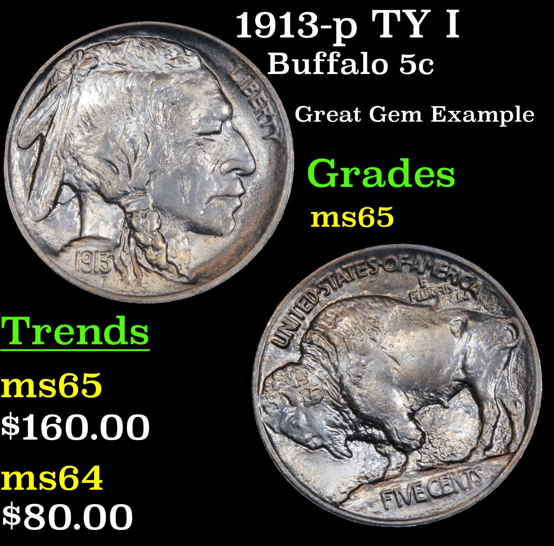 1913-p TY I . Great Gem Example Buffalo Nickel 5c Grades GEM Unc.