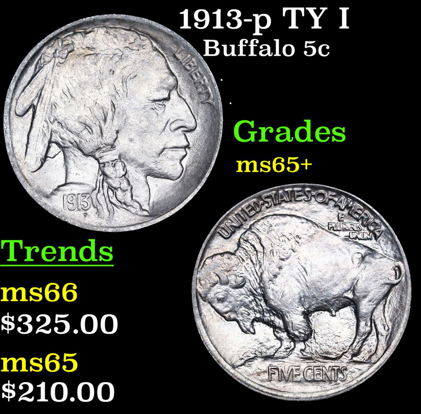 1913-p TY I Buffalo Nickel 5c Grades GEM+ Unc.
