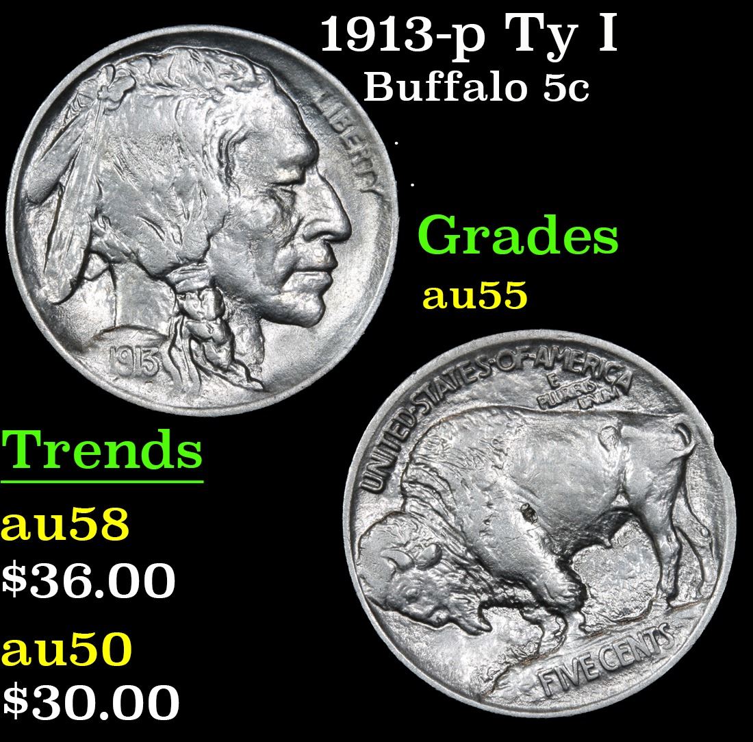 1913-p Ty I Buffalo Nickel 5c Grades Choice AU.