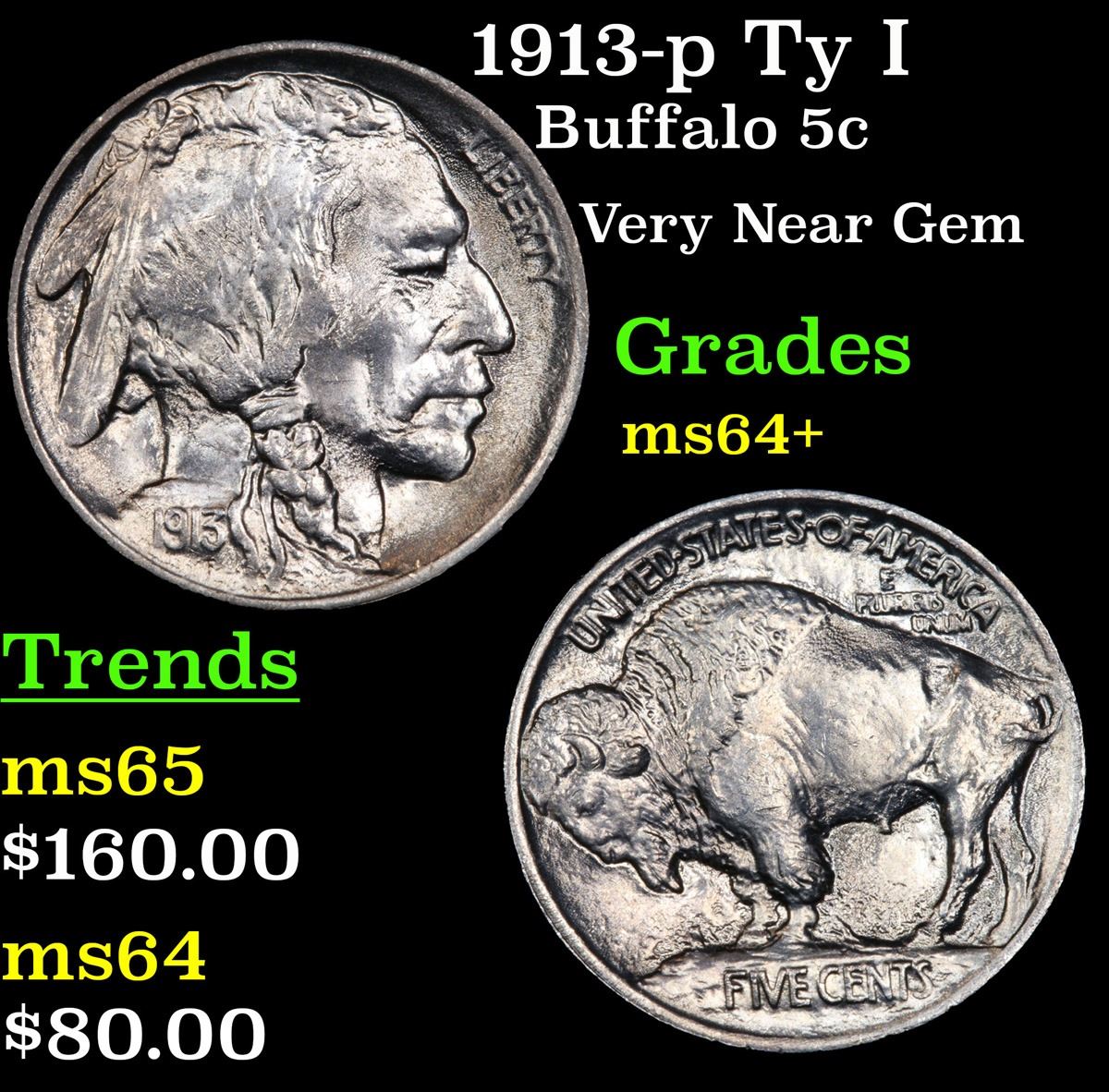 1913-p Ty I . Very Near Gem Buffalo Nickel 5c Grades Choice+ Unc.