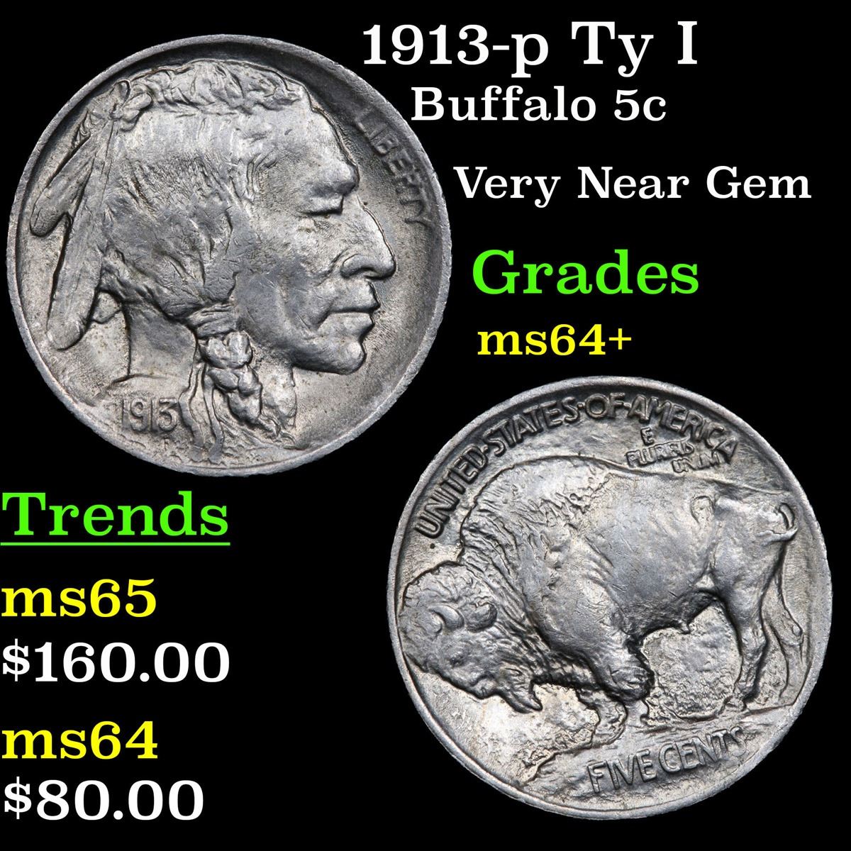 1913-p Ty I Buffalo Nickel 5c Grades Choice+ Unc.