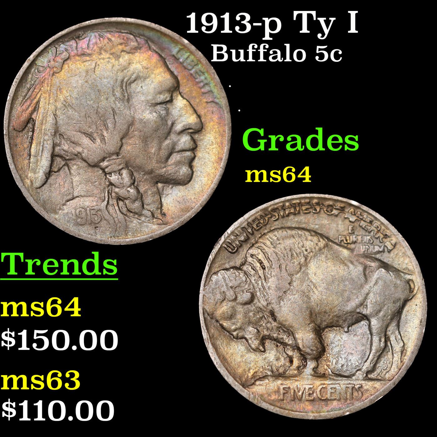 1913-p Ty I Buffalo Nickel 5c Grades Choice Unc.