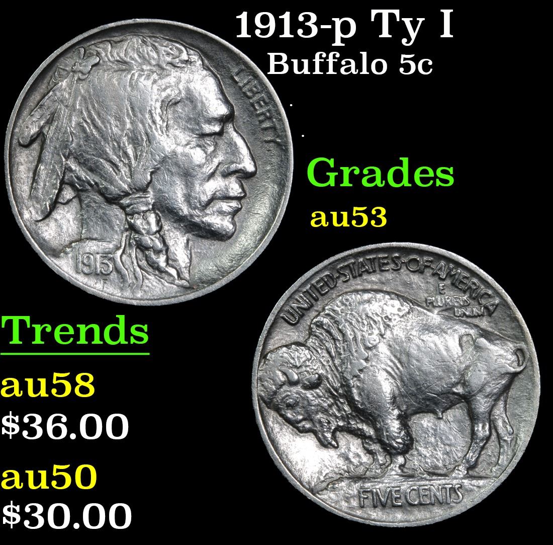 1913-p Ty I . . Buffalo Nickel 5c Grades Select AU.
