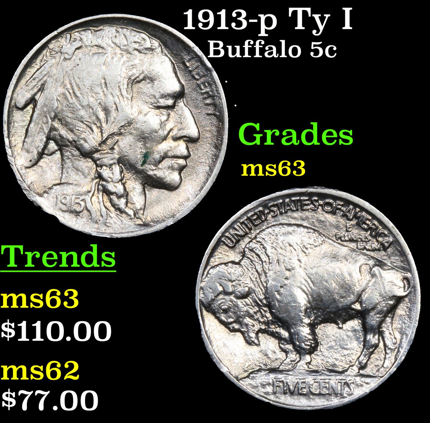 1913-p Ty I Buffalo Nickel 5c Grades Select Unc.