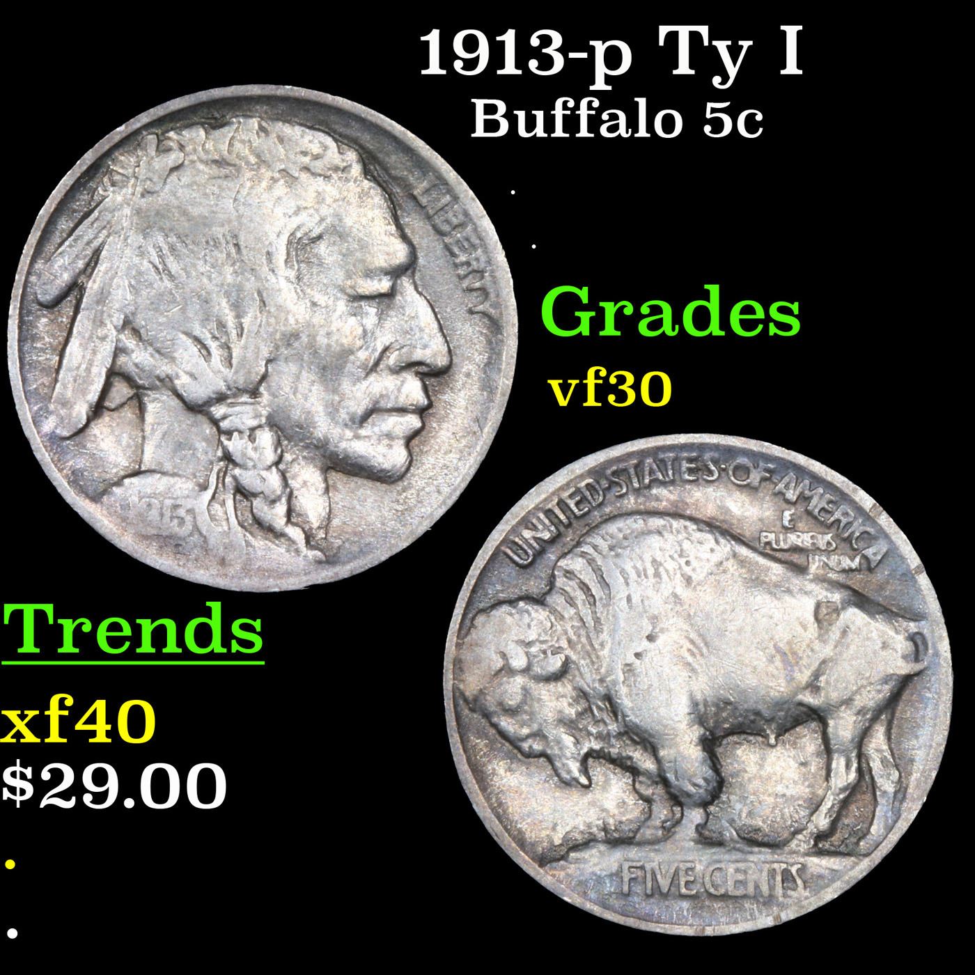 1913-p Ty I Buffalo Nickel 5c Grades vf++.