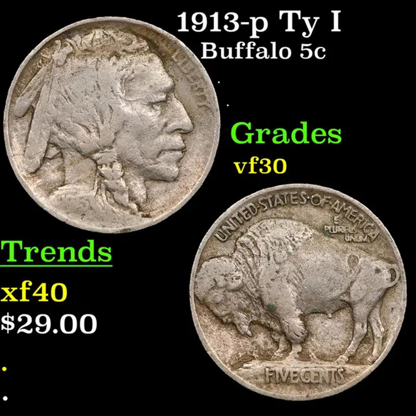 1913-p Ty I Buffalo Nickel 5c Grades vf++.