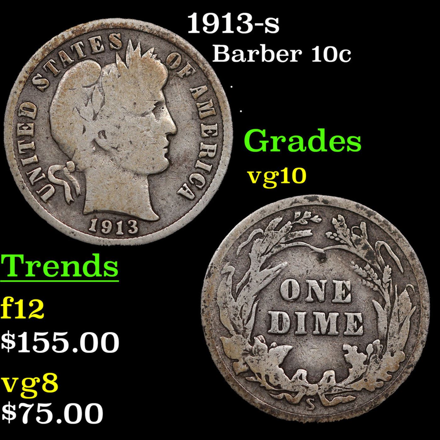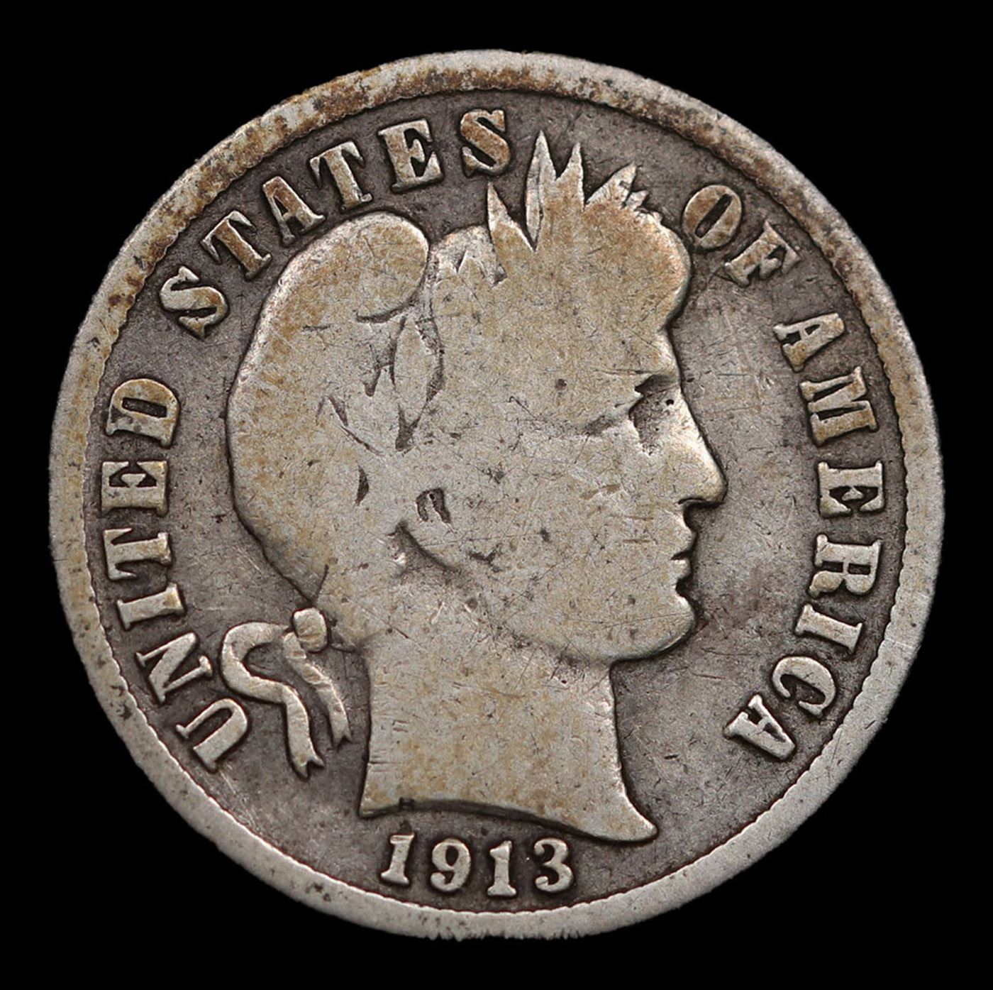 1913-s Barber Dime 10c Grades vg+. A very difficult date.