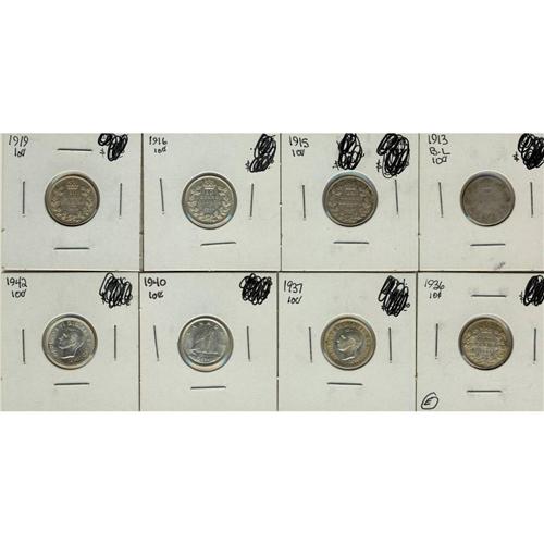 1913 to 1942 10¢. Lot of 8 coins G to BU. 1913 BL 10¢ is of good condition.