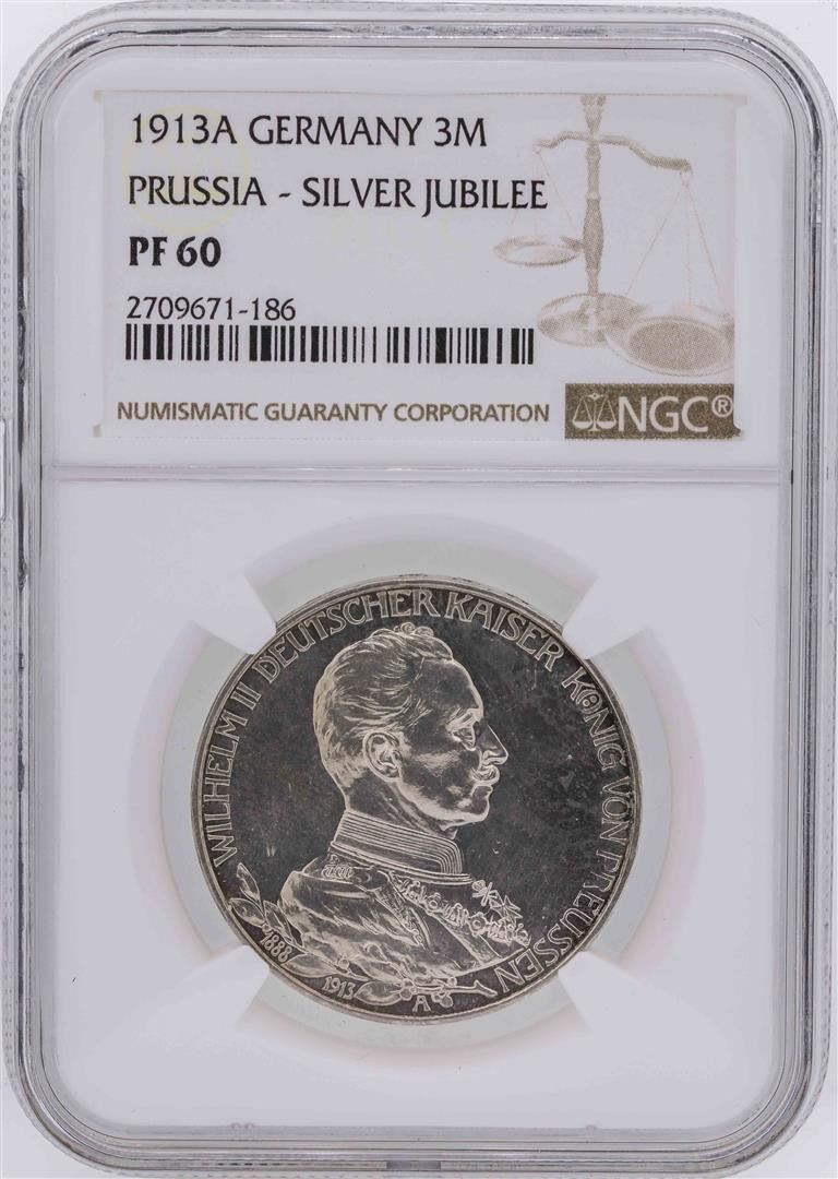 One 1913A Germany 3 Mark Prussia Silver Jubilee Coin NGC PF60. NGC Certified.