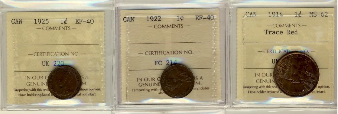 1914 1¢ MS62, 1922 & 1925 EF40. Lot of 3 ICCS coins.