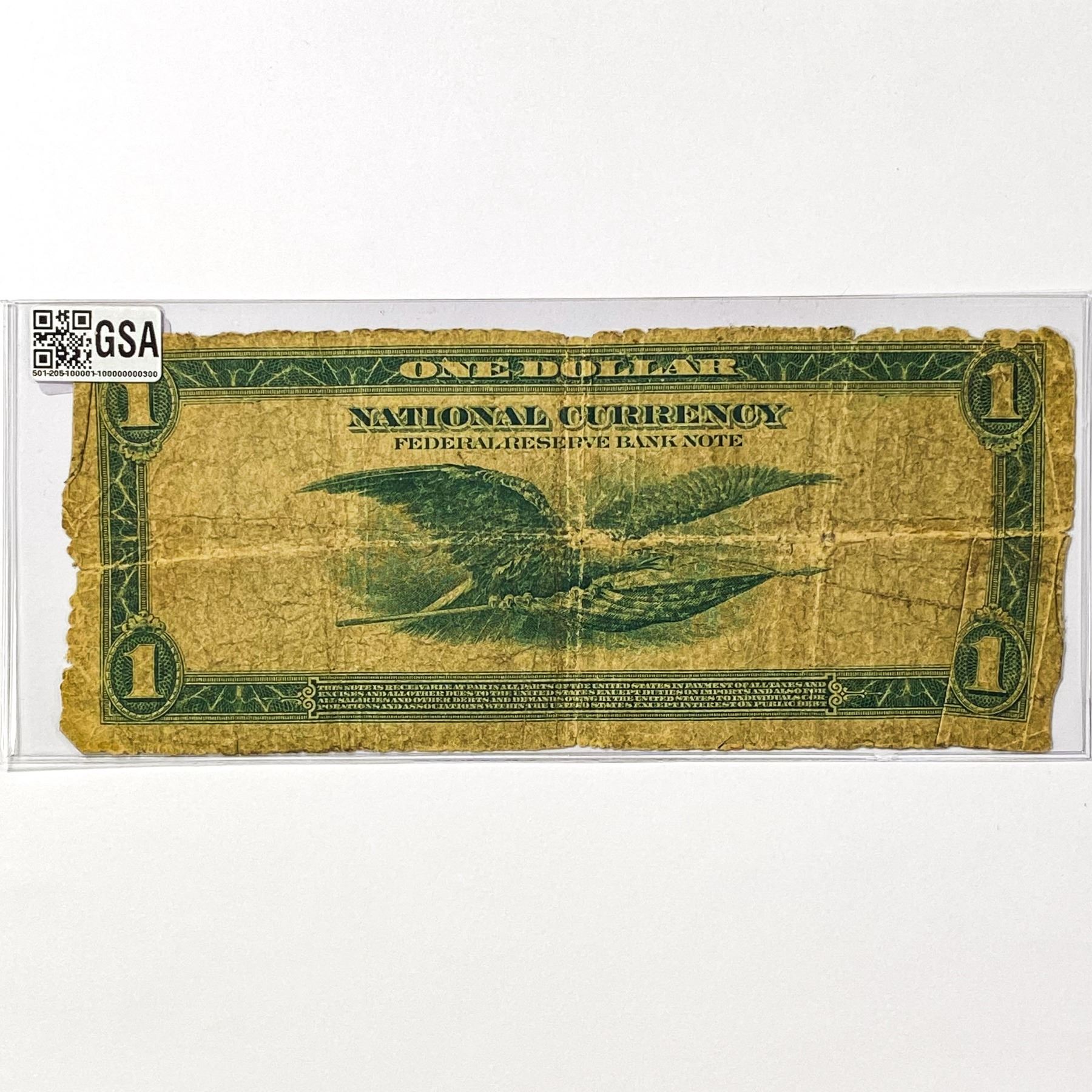 f. Notes sold referencing a third-party grading service are sold “AS IS” without any express or implied warranty, except for guarantee by GSA that they are genuine. Grading, condition or other attributes of any Product may have a material effect on its value and the opinion of others, including third-party grading services such as PCGS Currency and PMG may differ with that of GSA. GSA shall not be bound by any prior or subsequent opinion, determination, or certification by any grading service. Bidders specifically waive any claim to right of return of any Product because of the opinion, determination, or certification, or lack thereof, by any grading service. Certain warranties may be available from the grading services and Bidders are referred to them for further details: Paper Money Guaranty (PMG), PO Box 4711, Sarasota, FL 34230; PCGS Currency, PO Box 10470, Peoria, IL 61612-0470; PCGS Gold Shield, PO Box 9458, Newport Beach, CA 92658. Third-party graded notes are not returnable for any reason whatsoever.