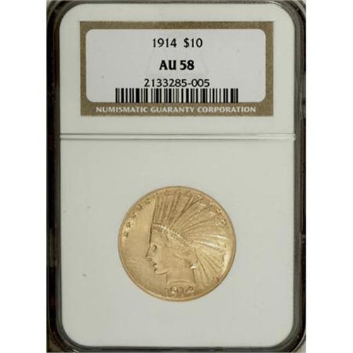 <B>1914 $10 AU58 NGC.</B></I> NGC Census: (174/1072). PCGS Population (169/864). Mintage: 151,050. Numismedia Wsl. Price for NGC/PCGS coin in AU58: $530. (#8875)<BR><BR><B>Coin Engraver:</B> Augustus Saint-Gaudens<BR><BR><b>Shipping:</b> Coins & Currency (<a target="_blank" href="http://www.heritageauctions.com/common/shipping.php">view shipping information</a>\)