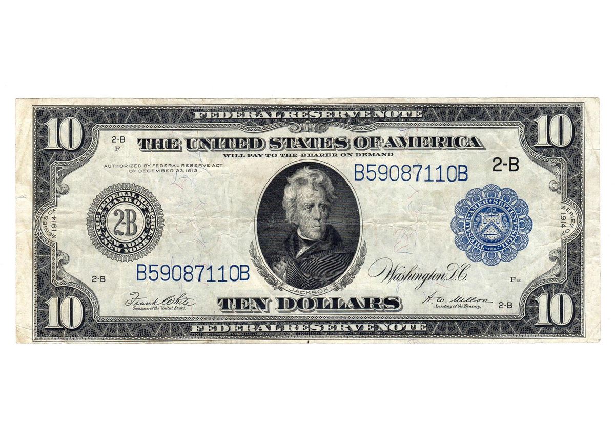 One 1914 $10 Blue Seal Large Federal Reserve Bank Note.