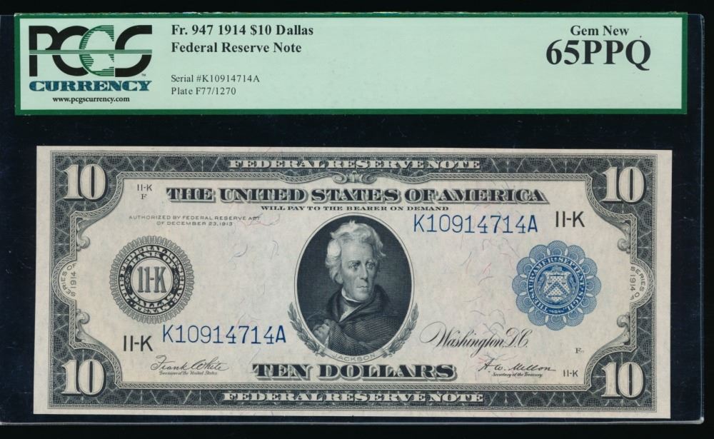 One 1914 $10 Dallas Federal Reserve Note PCGS 65PPQ.