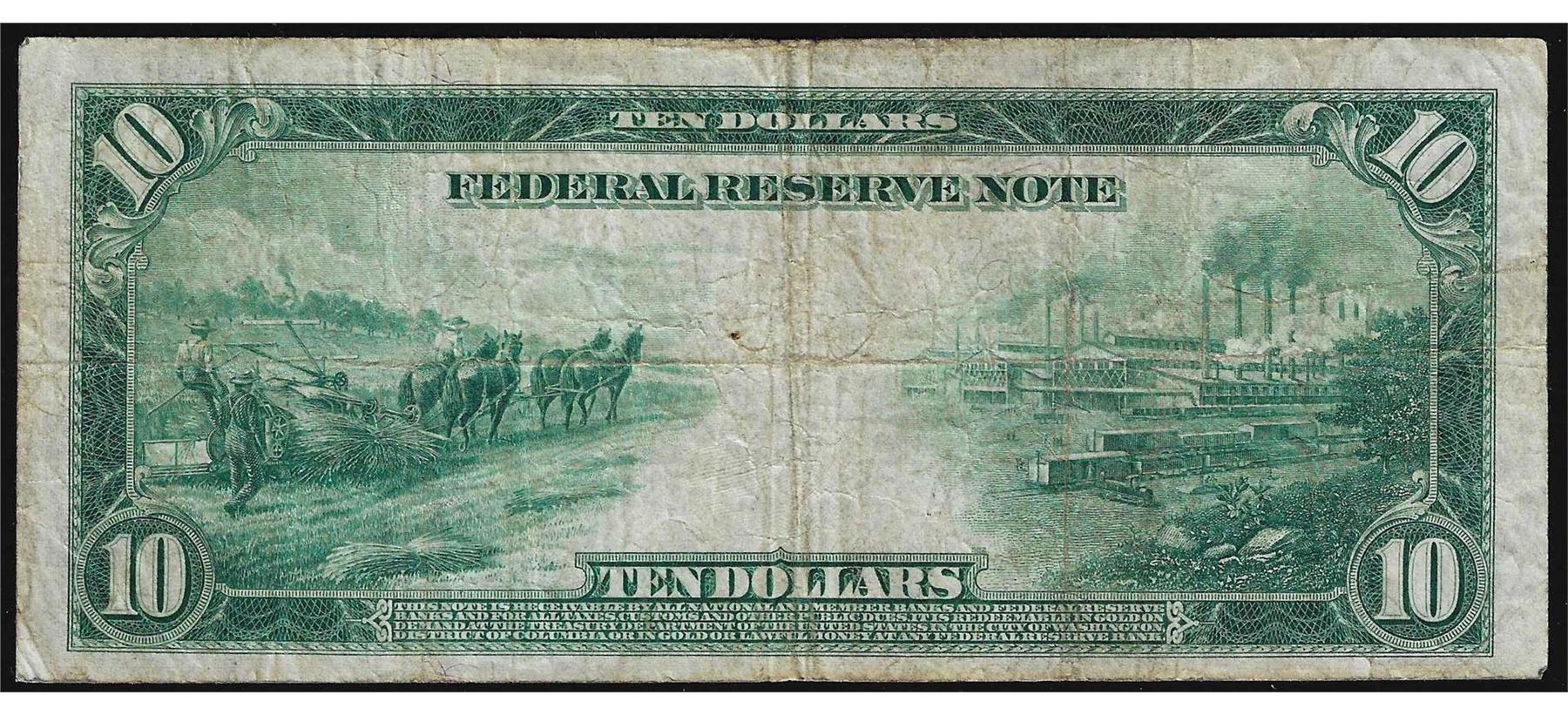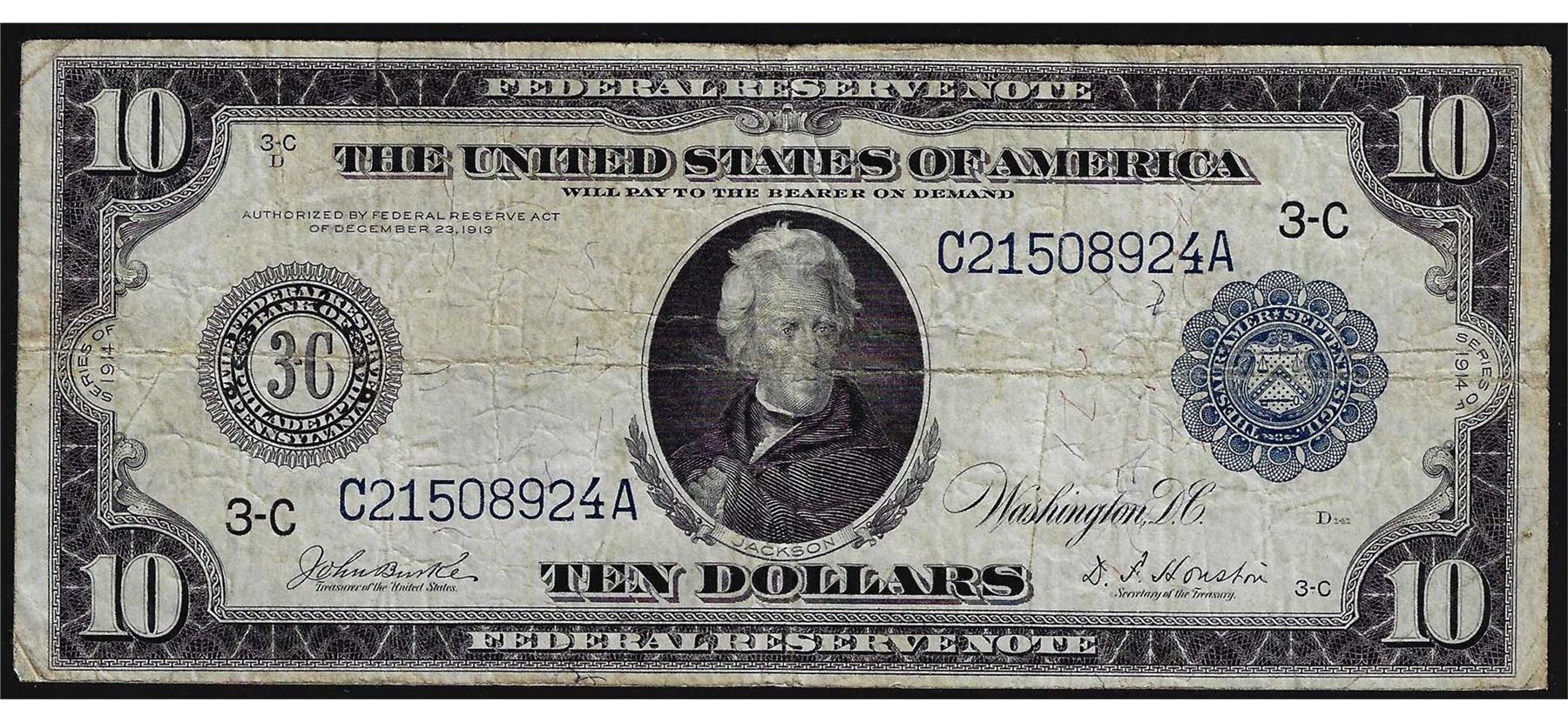 One 1914 $10 Federal Reserve Blue Seal Note.