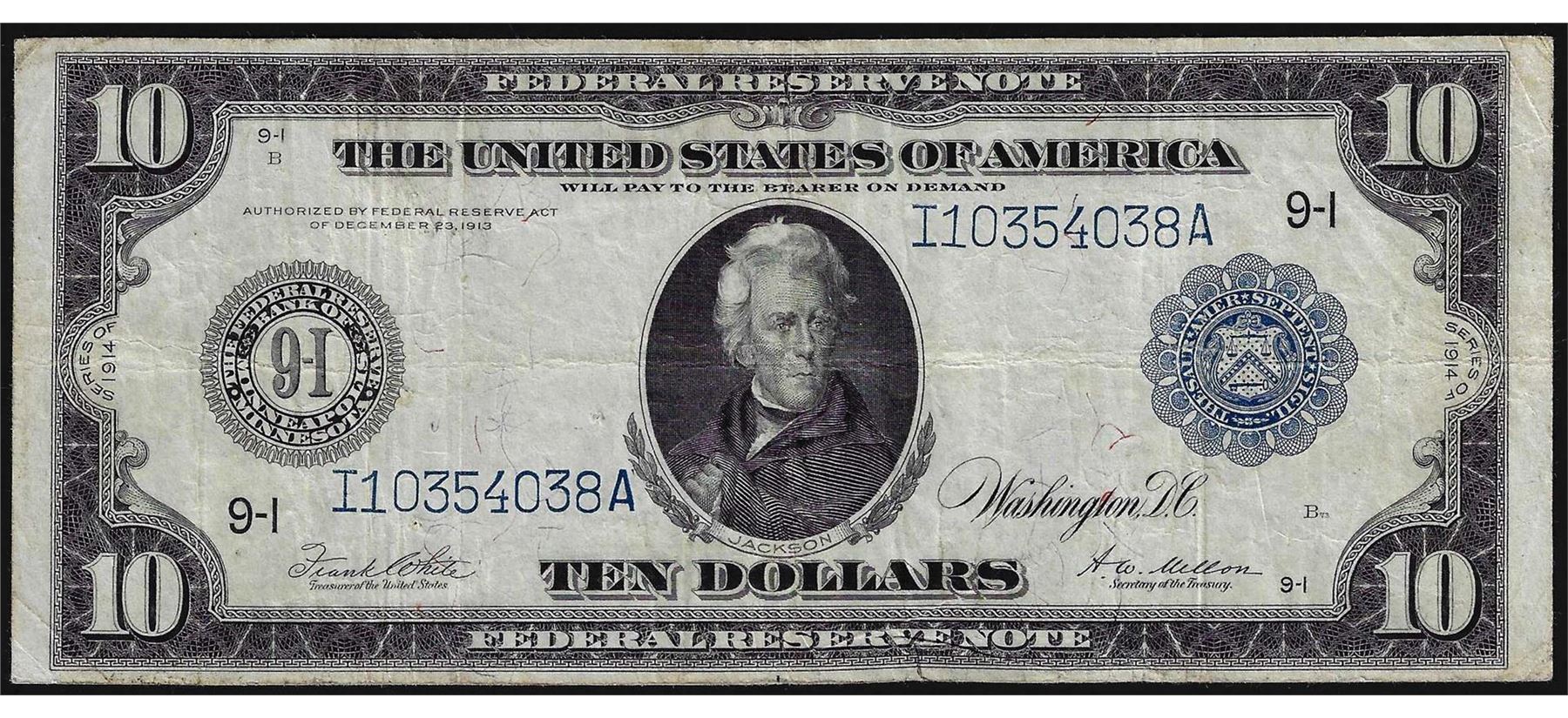 One 1914 $10 Federal Reserve Note Blue Seal.