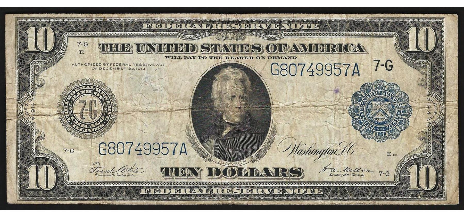 One 1914 $10 Federal Reserve Note Blue Seal.