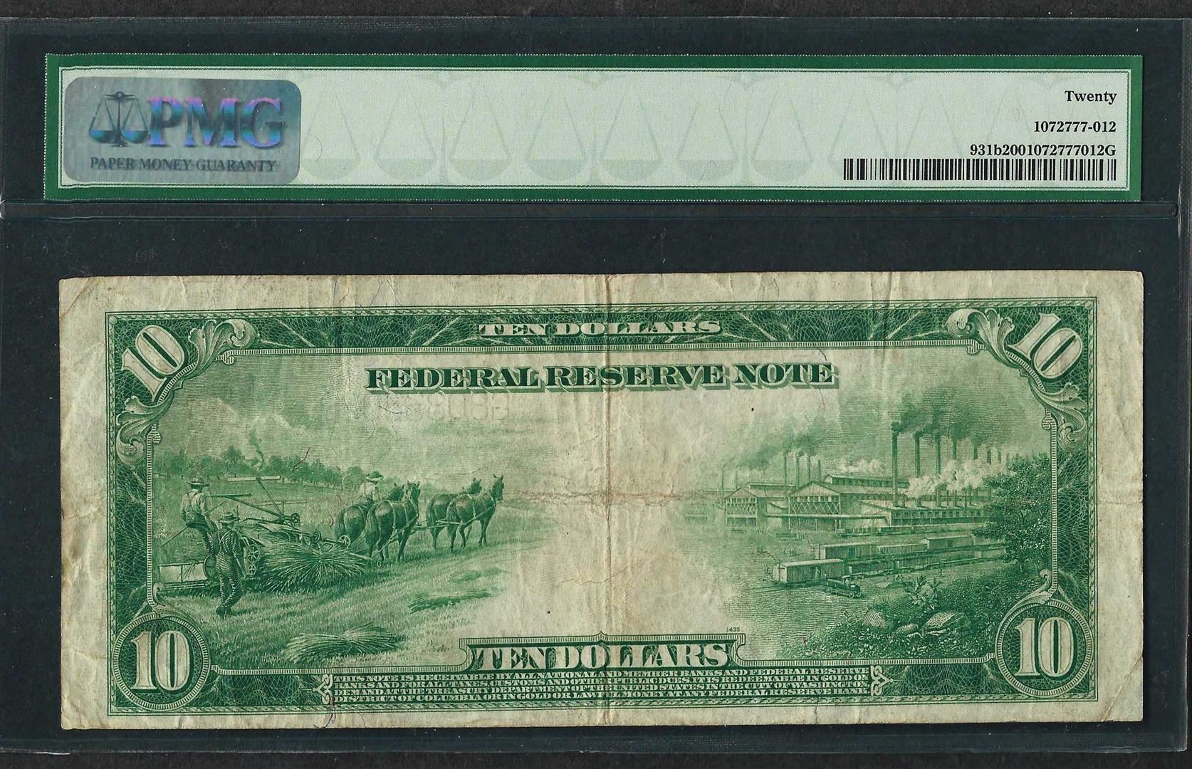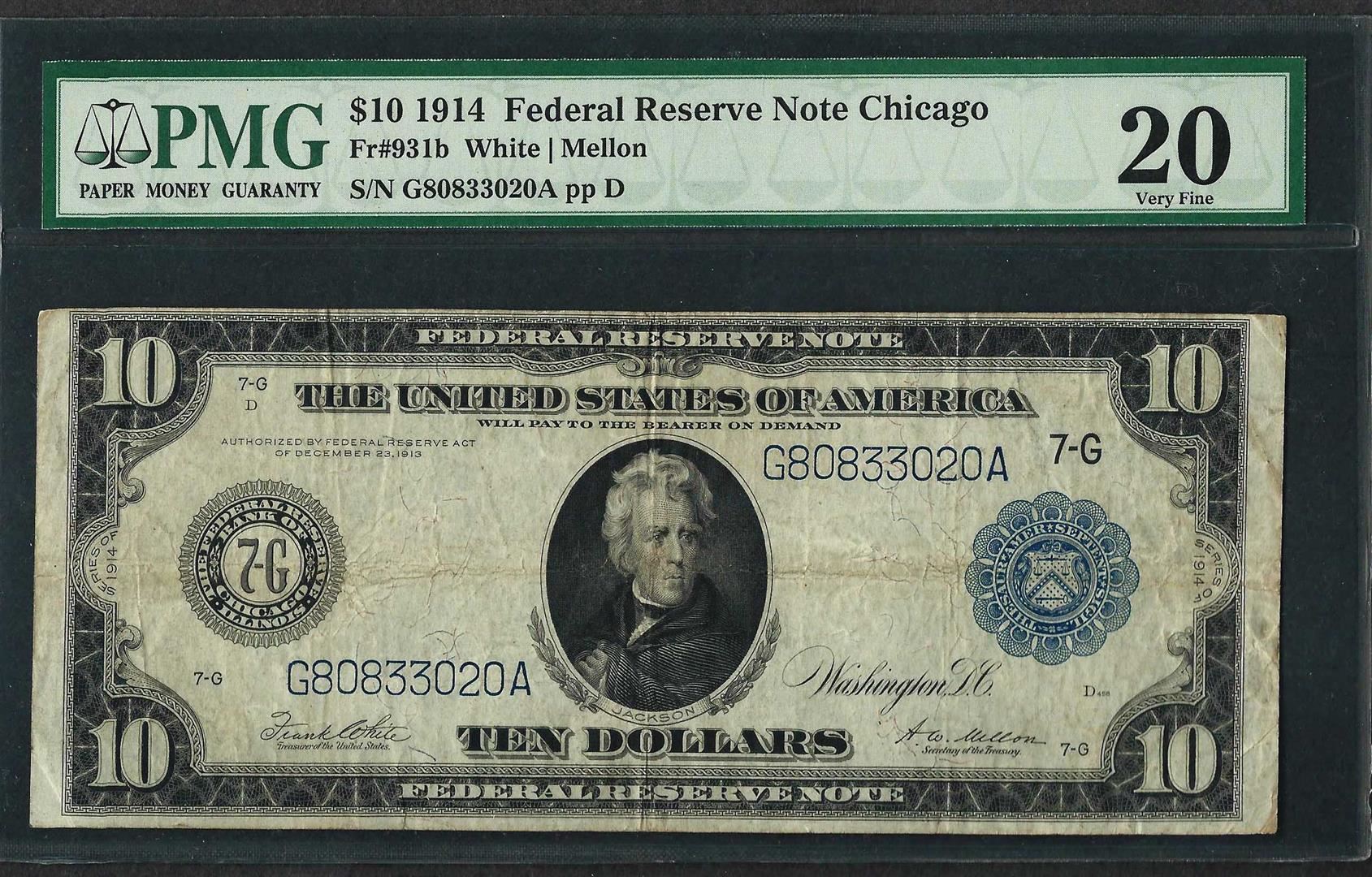 One 1914 $10 Federal Reserve Note Chicago Fr.9131b PMG Very Fine 20. PMG Certified.