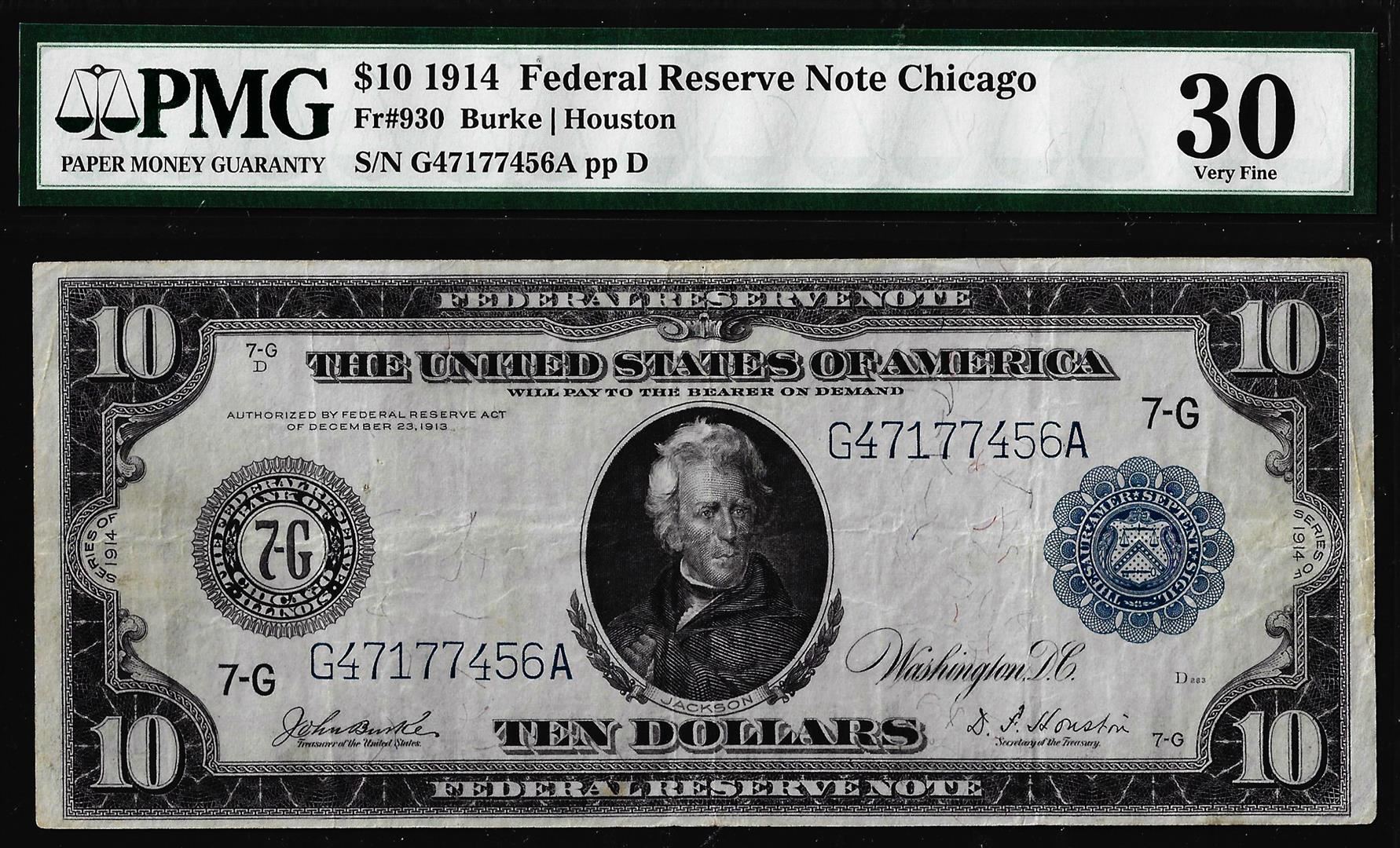 One 1914 $10 Federal Reserve Note Chicago Fr.930 PMG Very Fine 30. PMG Certified.