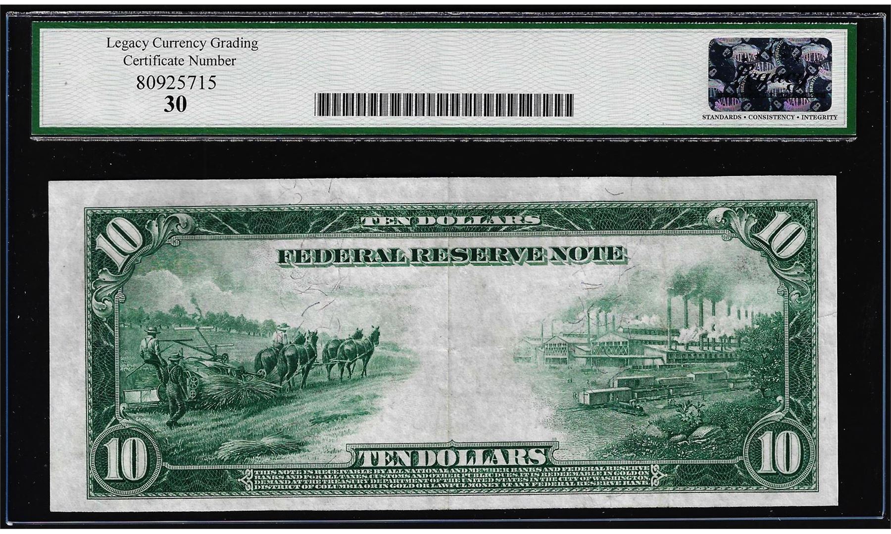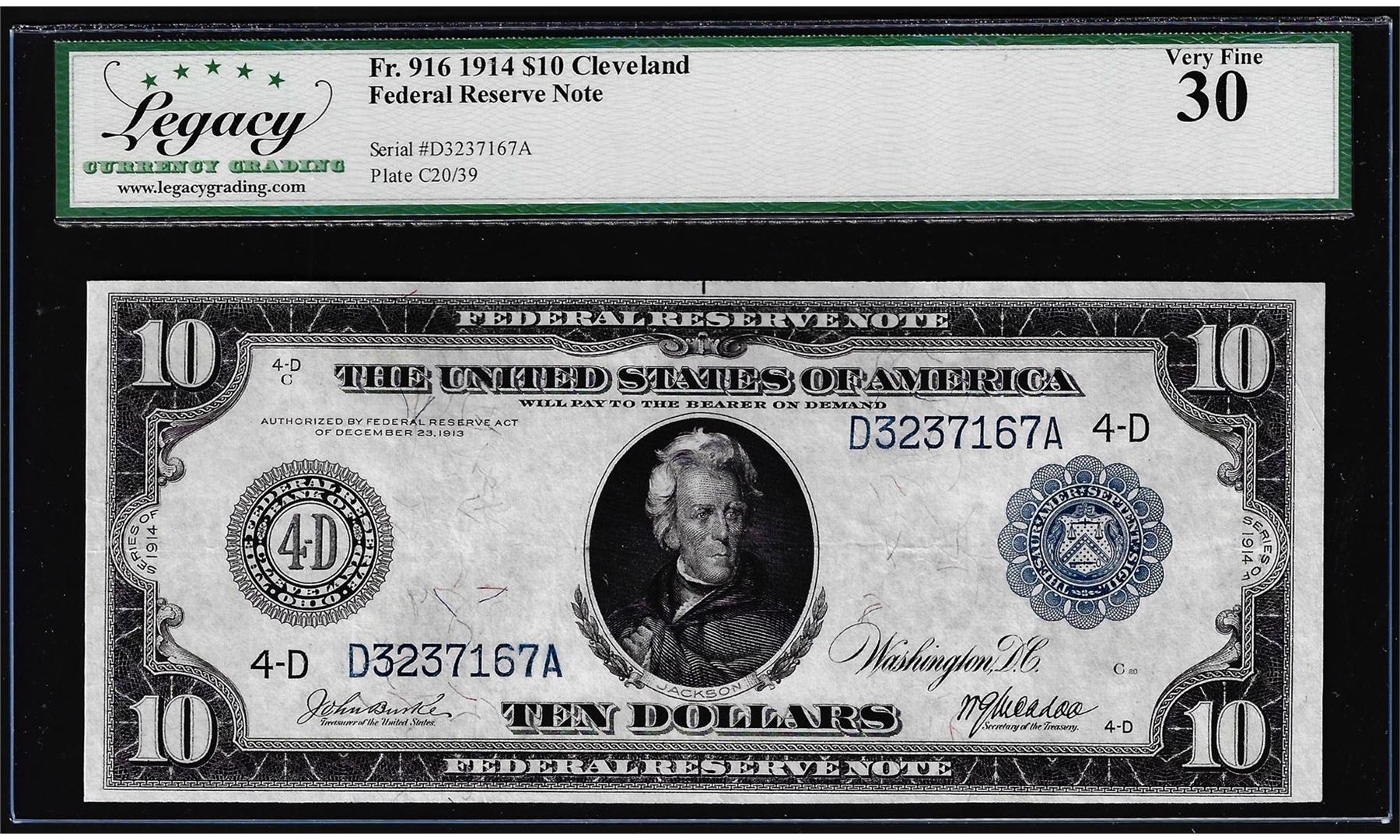 One 1914 $10 Federal Reserve Note Cleveland Fr.916 Legacy Very Fine 30. Legacy Graded.