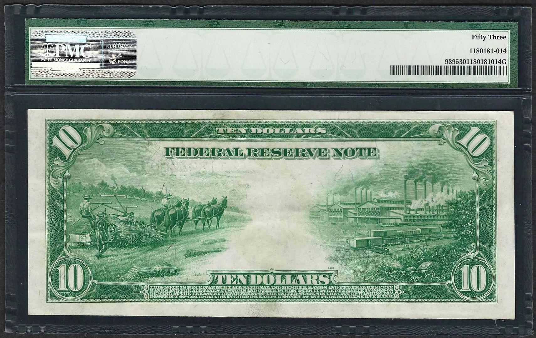 One 1914 $10 Federal Reserve Note Minneapolis Fr.939 PMG About Uncirculated 53. PMG Certified.