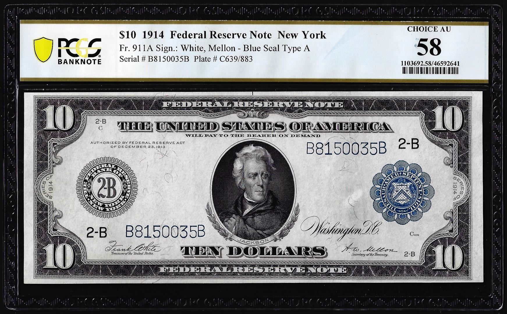 One 1914 $10 Federal Reserve Note New York Fr.911A PCGS Choice About Uncirculated 58. PCGS Graded.