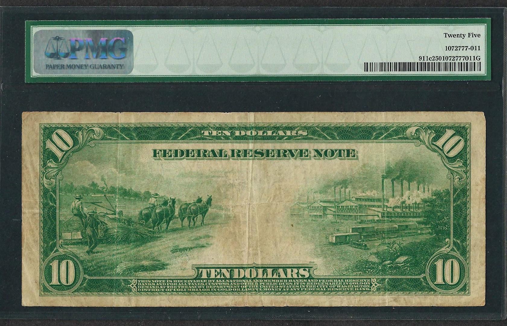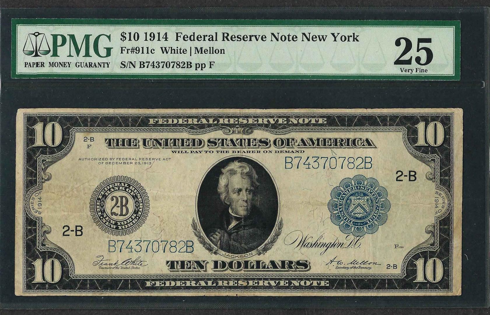 1914 $10 Federal Reserve Note New York Fr.911c PMG Very Fine 25