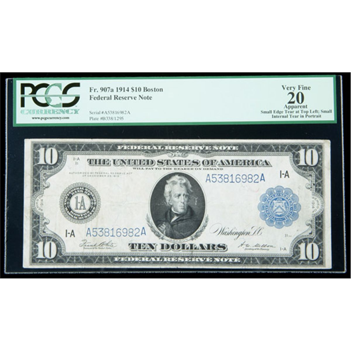 1914, $10 Federal Reserve Note. PCGS Very Fine 20 Apparent. . Fr-907a. The graders at PCGS Currency noted a small edge tear at the top left and a small internal tear in the portrait. From the Boston district bank.