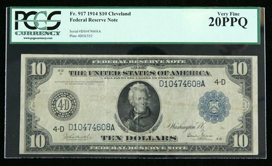 1914, $10 Federal Reserve Note. PCGS Very Fine 20PPQ. . Fr-917. Crisp and bright, from the Cleveland district bank.