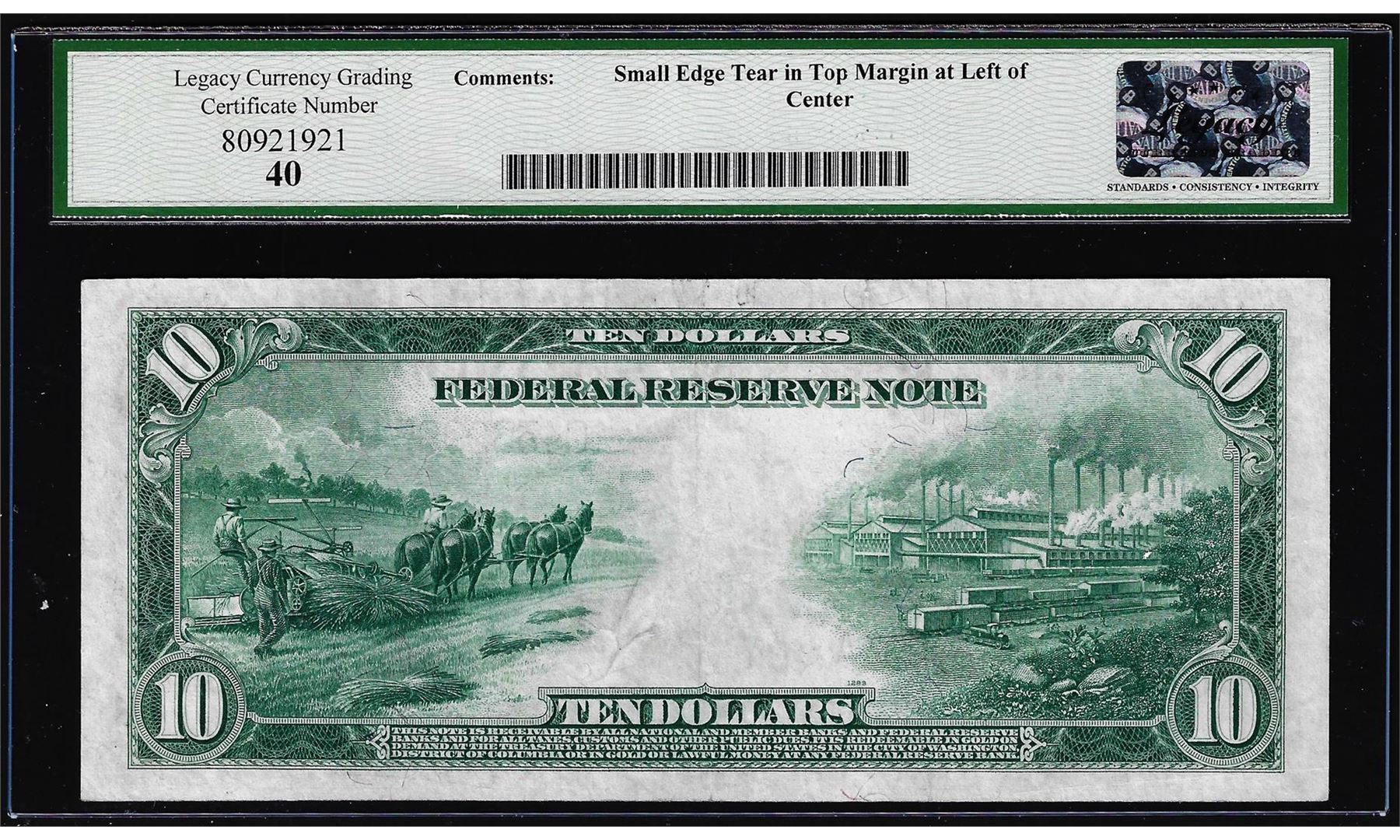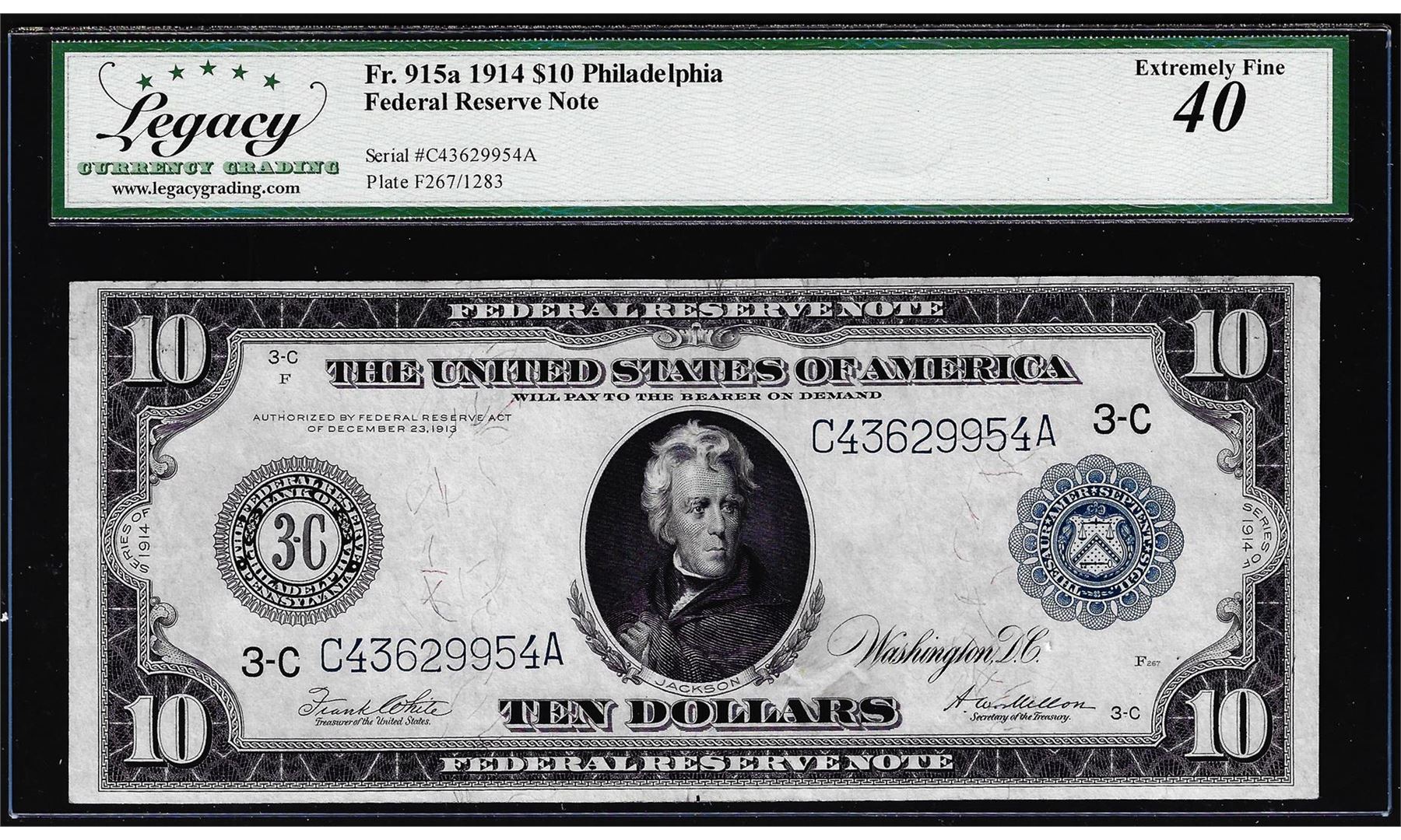 One 1914 $10 Federal Reserve Note Philadelphia Fr.915a Legacy Extremely Fine 40. Legacy Graded.