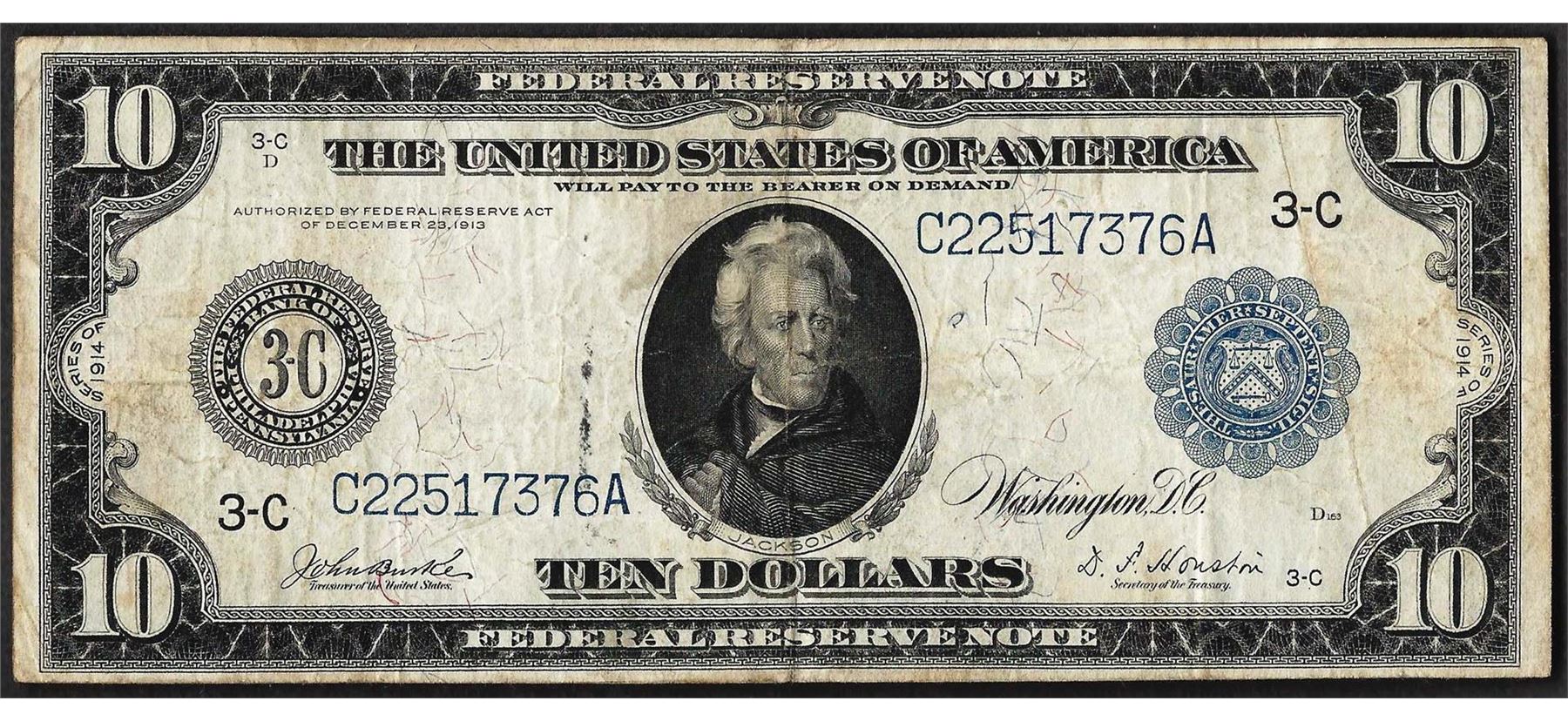 One 1914 $10 Federal Reserve Note Philadelphia.
