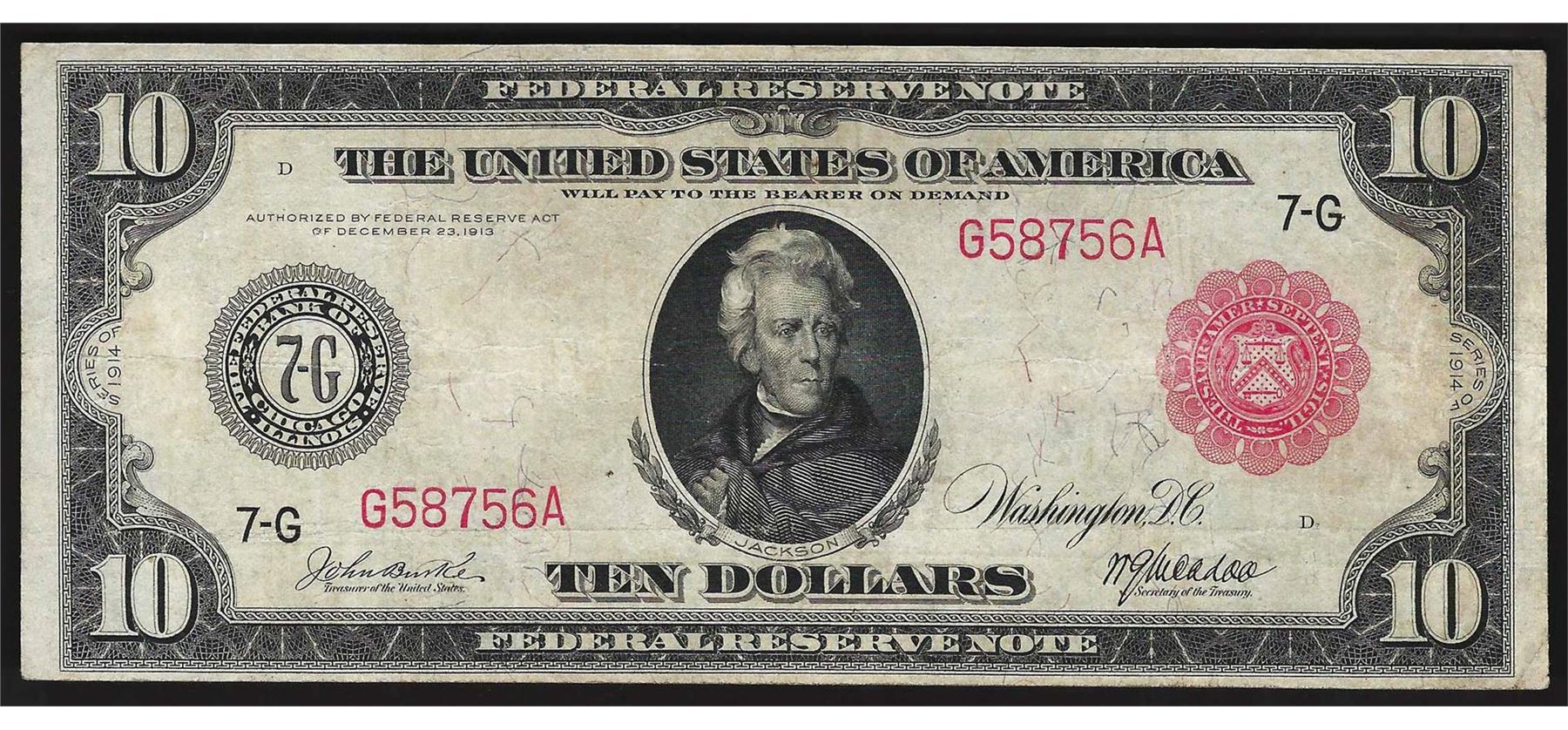 One 1914 $10 Federal Reserve Note Red Seal.