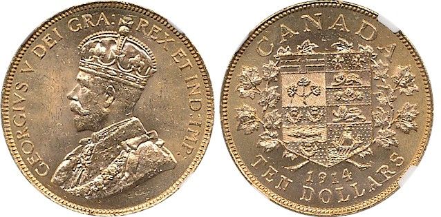 1914 $10 Gold NGC MS64. Designated as part of The Bank of Canada hoard.