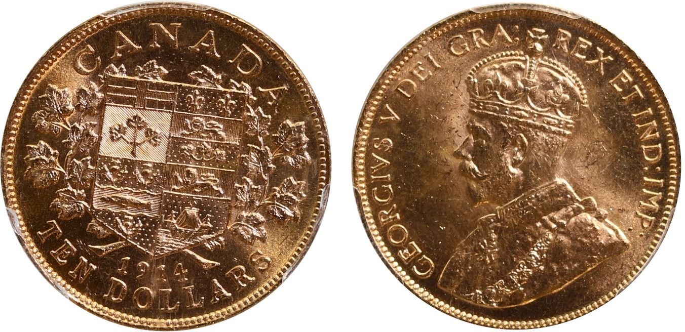 1914 $10 Gold PCGS Gem Uncirculated-65. Superb lustrous example with great fields and clean surfaces. From the Canadian Gold Reserve.