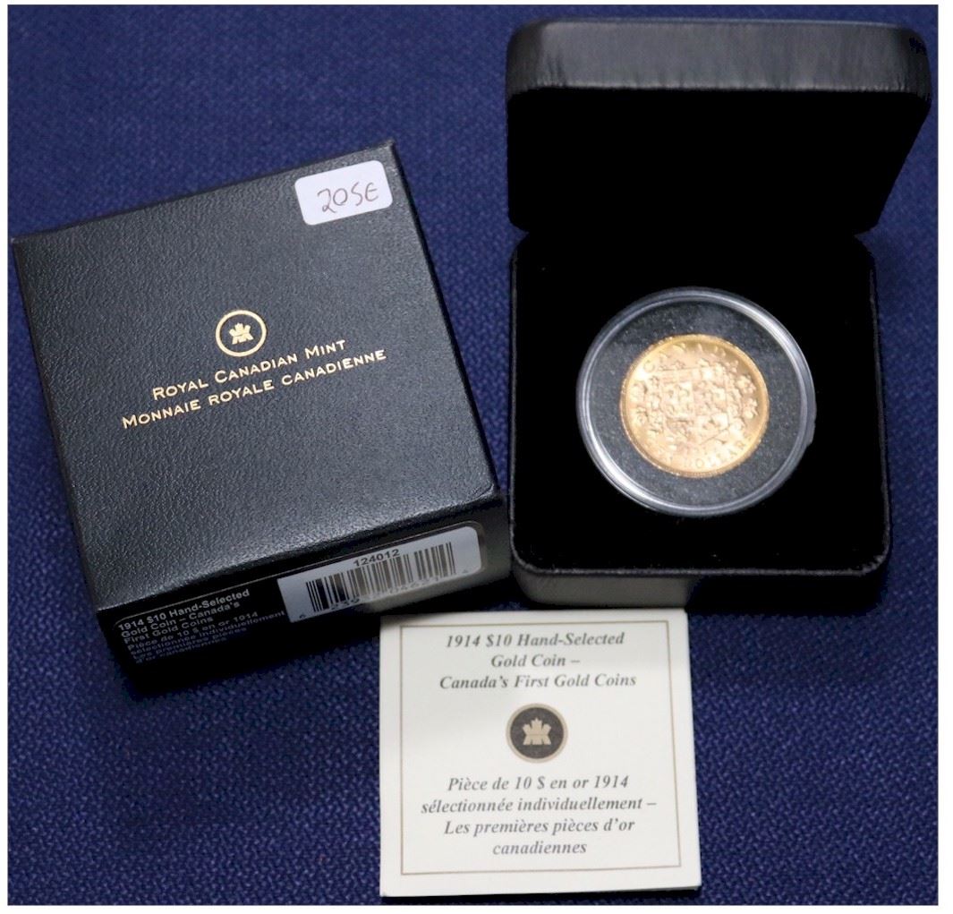 1914 $10 Hand-selected Gold Coin issued by the RCM - Canada's First Gold Coins. Comes with all original packaging from the Mint including the COA, black original case and outer cardboard sleeve.