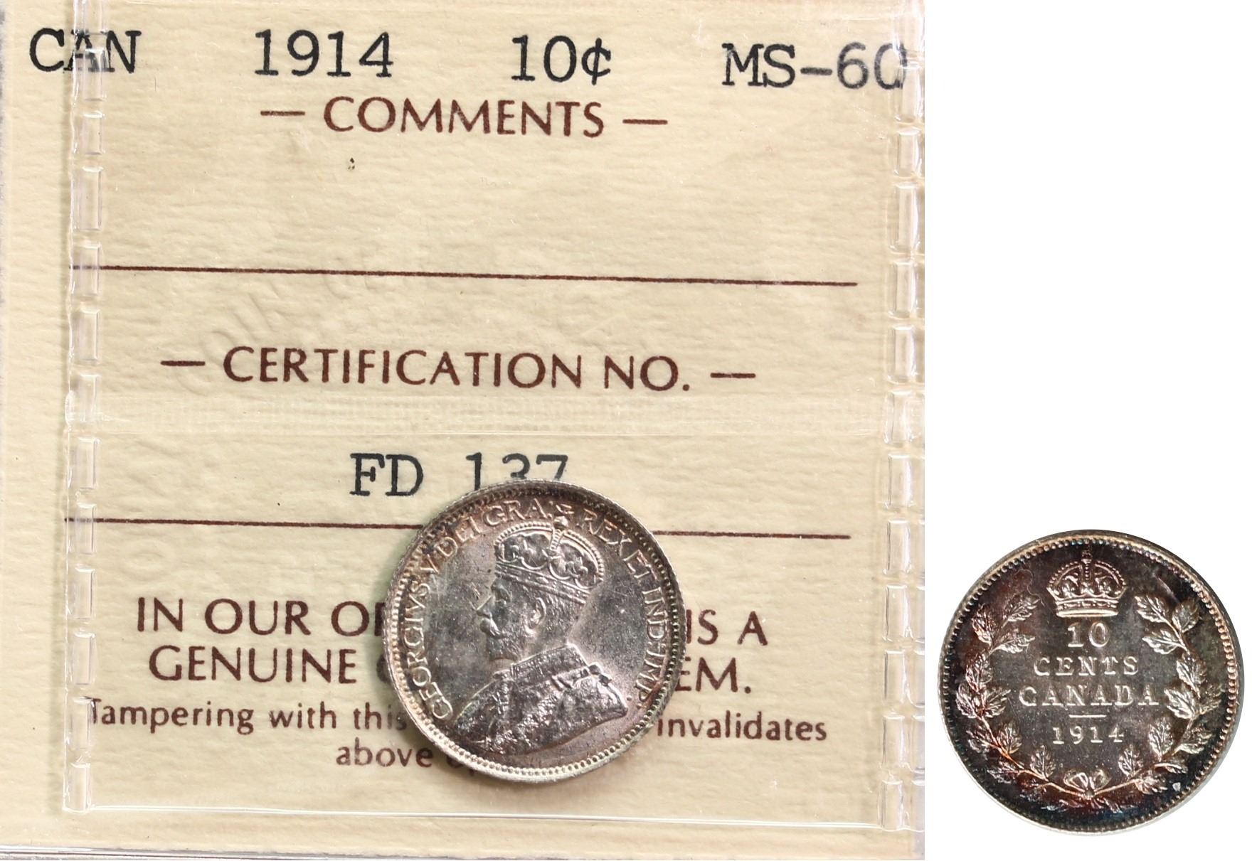 1914 10¢ ICCS Mint State-60 Brilliant and lustrous with russet tone.