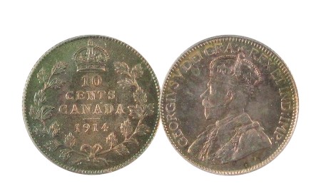 1914 10¢ ICCS/PCGS MS66. Gold tones and strong lustre. Rare this nice.