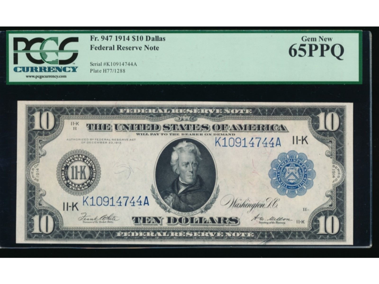 One 1914 $10 Large Dallas Federal Reserve Note PCGS 65PPQ.