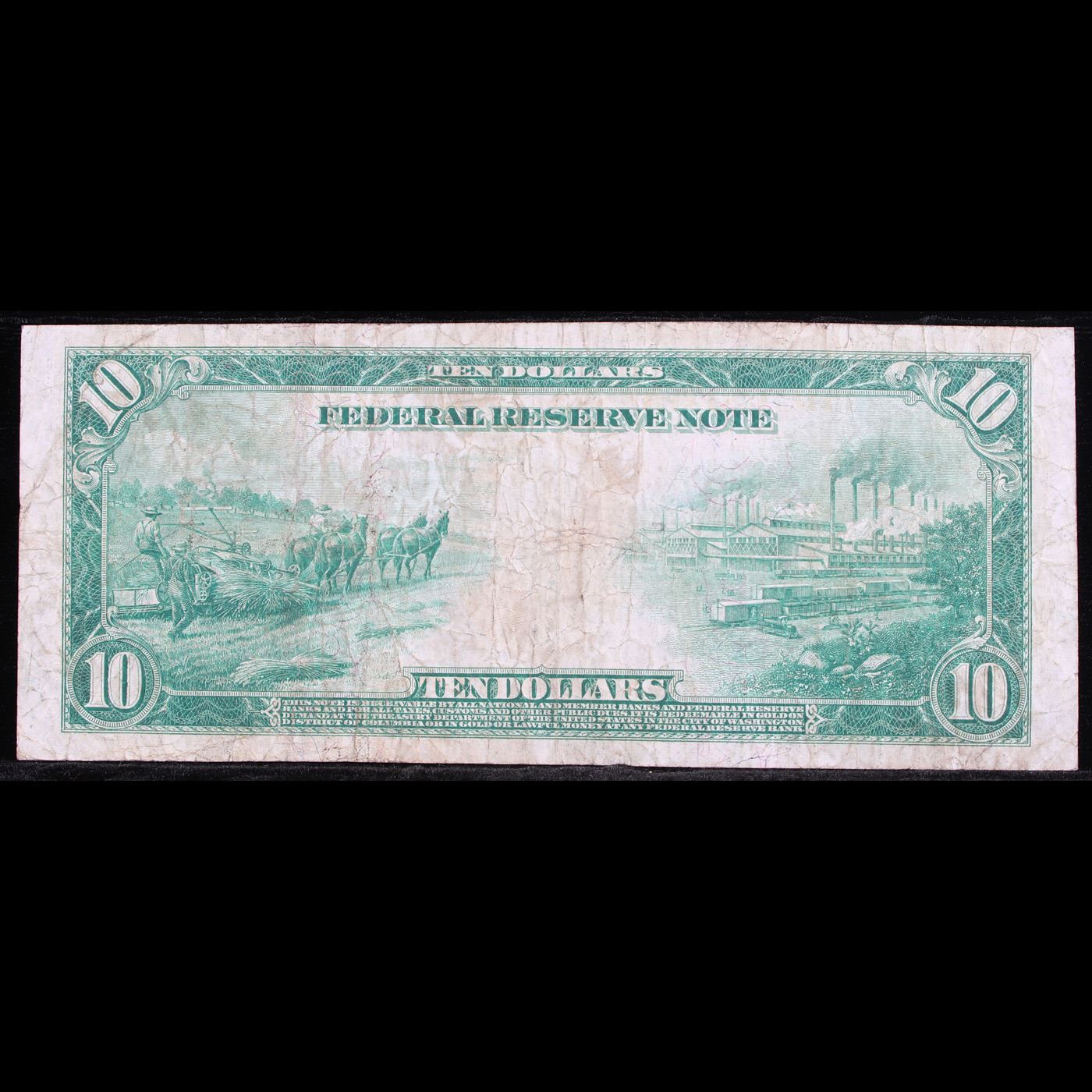 1914 $10 Large Size Blue Seal Federal Reserve Note 10-J KA missouri Fr-934 Grades vf+. Despite having 1913 written on them, these are actually from the series of 1914, as it says on the right and left hands side of each note. An engraved portrait of President Andrew Jackson is on the note's face and the back features two vignettes titled Farming and Industry