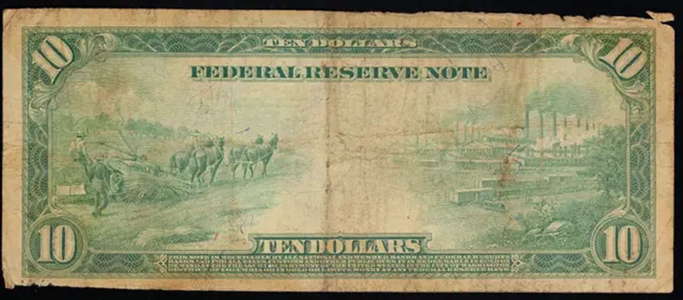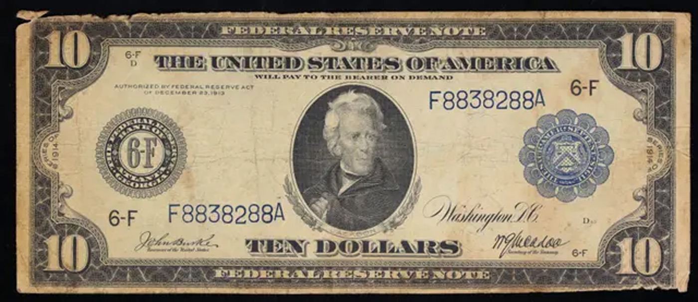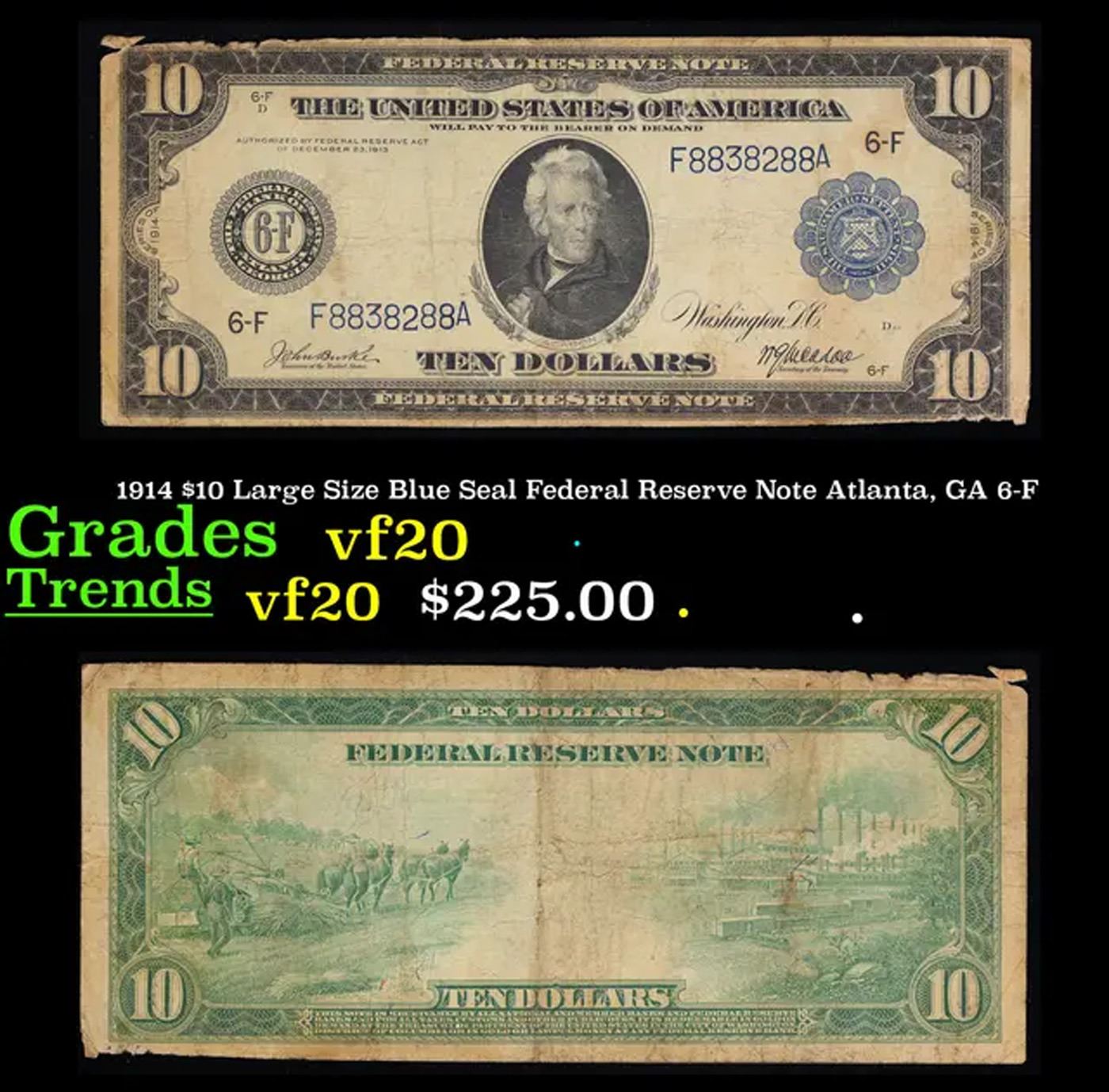 1914 $10 Large Size Blue Seal Federal Reserve Note Atlanta, GA 6-F Grades vf, very fine. Despite having 1913 written on them, these are actually from the series of 1914, as it says on the right and left hands side of each note. An engraved portrait of President Andrew Jackson is on the note's face and the back features two vignettes titled Farming and Industry