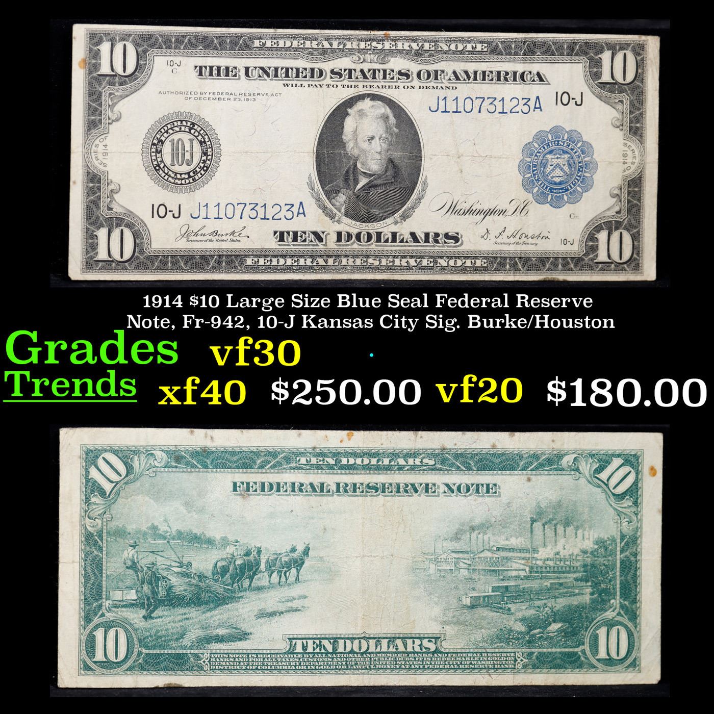 1914 $10 Large Size Blue Seal Federal Reserve Note, Fr-942, 10-J Kansas City Sig. Burke/Houston Grad