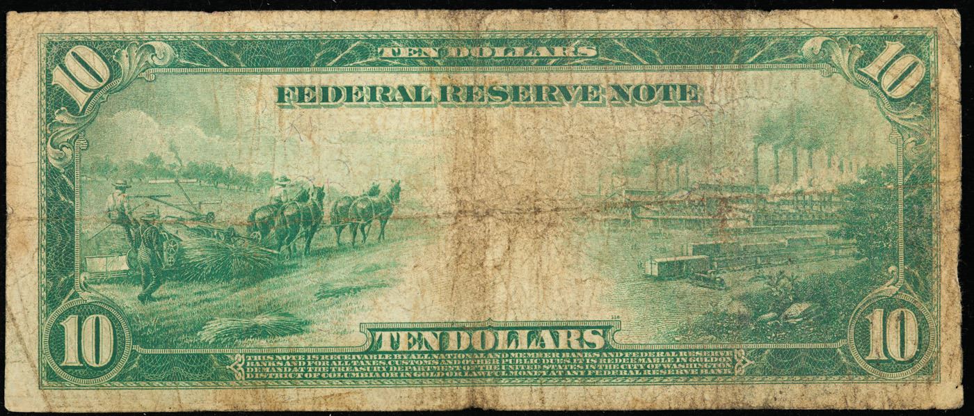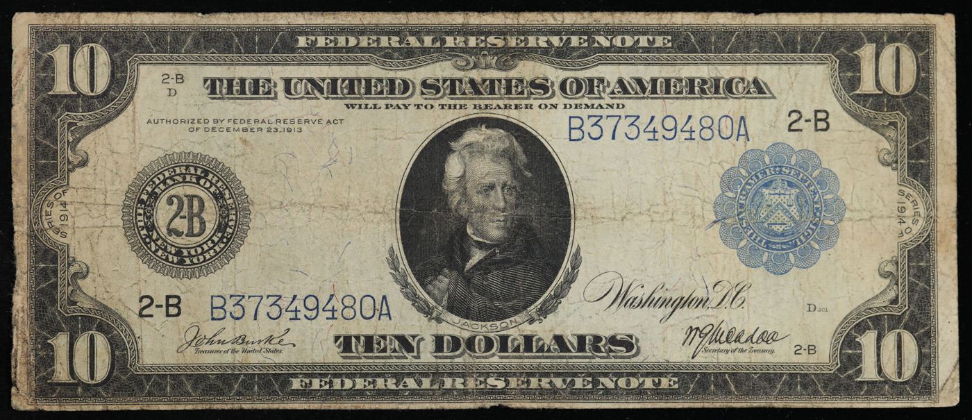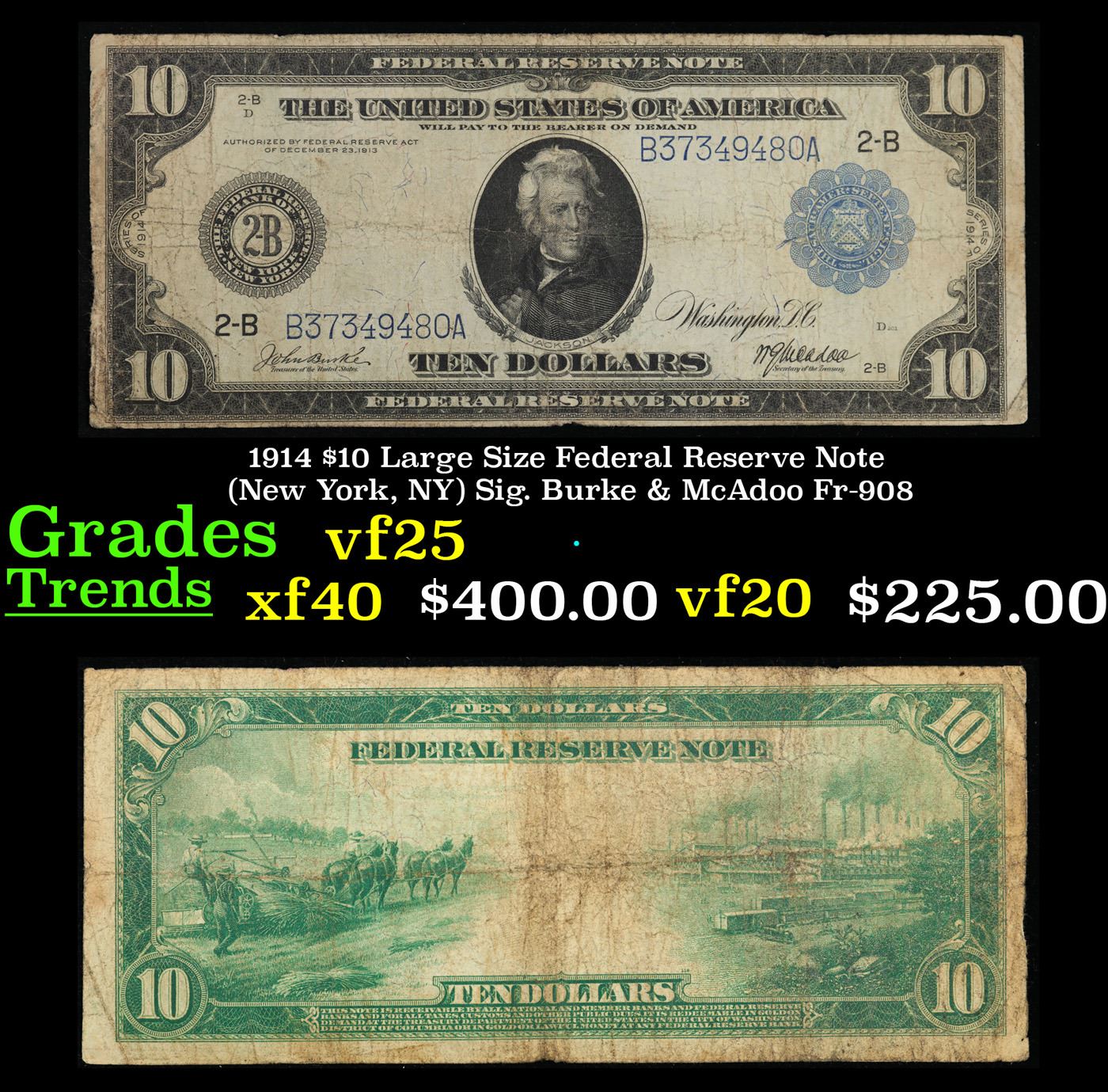 1914 $10 Large Size Federal Reserve Note (New York, NY) Sig. Burke & McAdoo Fr-908 Grades vf+.