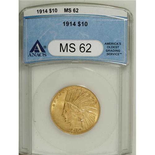 <B>1914 $10 MS62 ANACS.</B></I> NGC Census: (389/325). PCGS Population (346/398). Mintage: 151,050. Numismedia Wsl. Price for NGC/PCGS coin in MS62: $1,100. (#8875)<BR><BR><b>Shipping:</b> Coins & Currency (<a target="_blank" href="http://www.heritageauctions.com/common/shipping.php">view shipping information</a>)