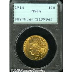 <B>1914 $10 MS64 PCGS.</B></I> Pretty gold-orange patination over lustrous surfaces give this piece excellent eye appeal. Some small marks on the Indian's cheek and neck limit the grade.