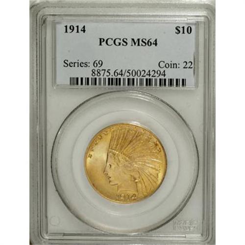 <B>1914 $10 MS64 PCGS.</B></I> Sun-gold and butter-yellow shades predominate on this shining near-Gem. The devices are well-defined overall and free of significant distractions, though minor marks are noted in the fields. The lowest mintage Philadelphia issue of the series.<BR><I>From The Parker Lee III Collection.</B></I><BR><BR><B>Coin Engraver:</B> Augustus Saint-Gaudens<BR><BR><b>Shipping:</b> Coins & Currency (<a target="_blank" href="http://www.heritageauctions.com/common/shipping.php">view shipping information</a>)