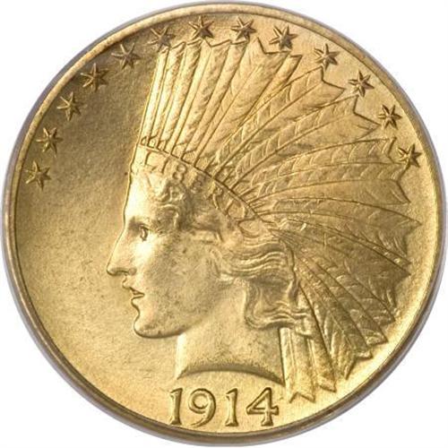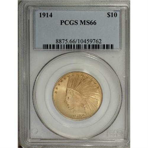 <B>1914 $10 MS66 PCGS.</B></I> A well struck Premium Gem with booming luster and lovely apricot and yellow-gold surfaces that show only the most trivial of flaws, even with intense scrutiny. The exquisite fields show a touch of satin. Philadelphia Mint eagle production annually exceeded 400,000 pieces between 1911 and 1913, but in 1914, the mintage was limited to 151,000 business strikes and 50 proofs. Presumably, the reason for the reduced mintage was the outbreak of the Great War in Europe. Shipping bullion was dangerous during wartime due to enemy submarines. While Philadelphia's production of eagles rebounded in 1915, that facility would strike no more examples of the denomination until 1926. Population: 7 in 66, 2 finer (2/08).<BR><BR><B>Coin Engraver:</B> Augustus Saint-Gaudens<BR><BR><b>Shipping:</b> Coins & Currency (<a target="_blank" href="http://www.heritageauctions.com/common/shipping.php">view shipping information</a>)