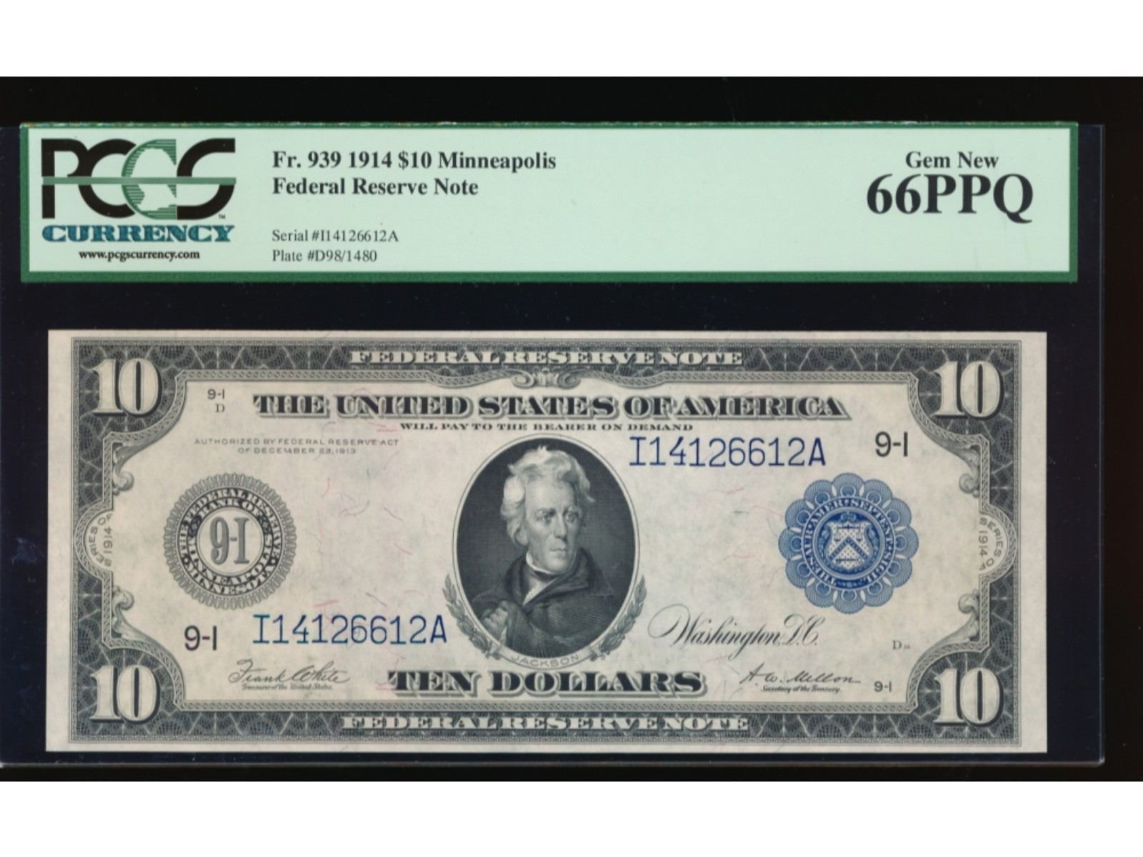 One 1914 $10 Minneapolis Federal Reserve Note PCGS 66PPQ.