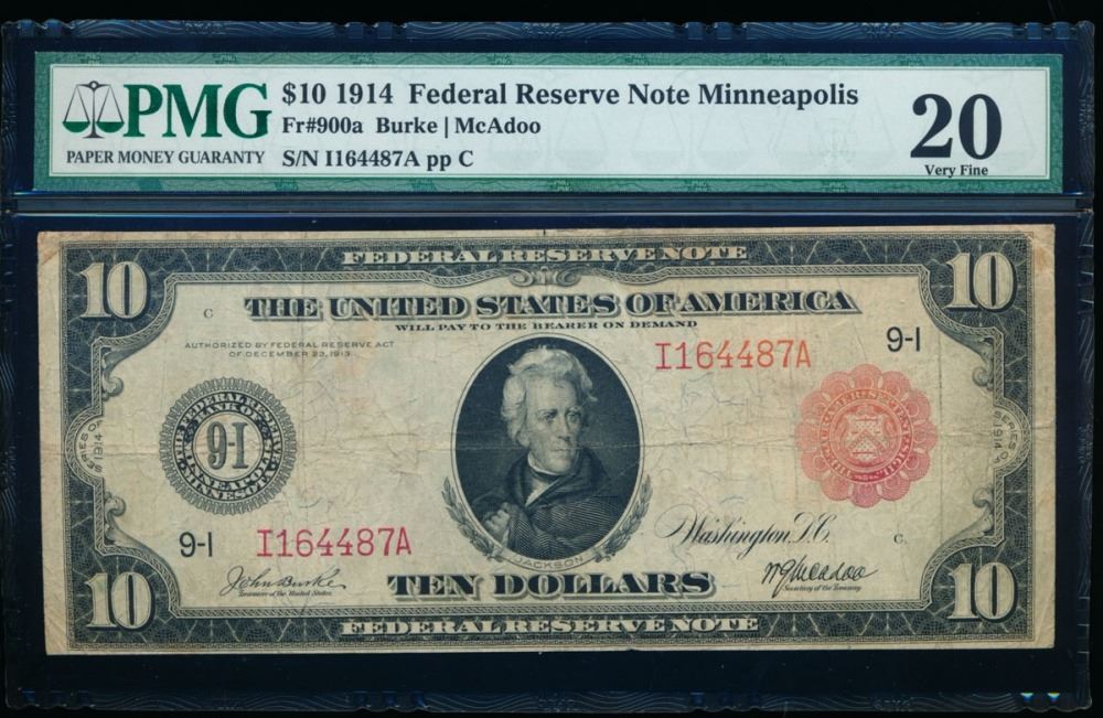 One 1914 $10 Minneapolis Red Seal Federal Reserve Note PMG 20.