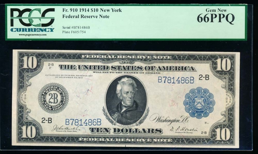 One 1914 $10 New York Federal Reserve Note PCGS 66PPQ.