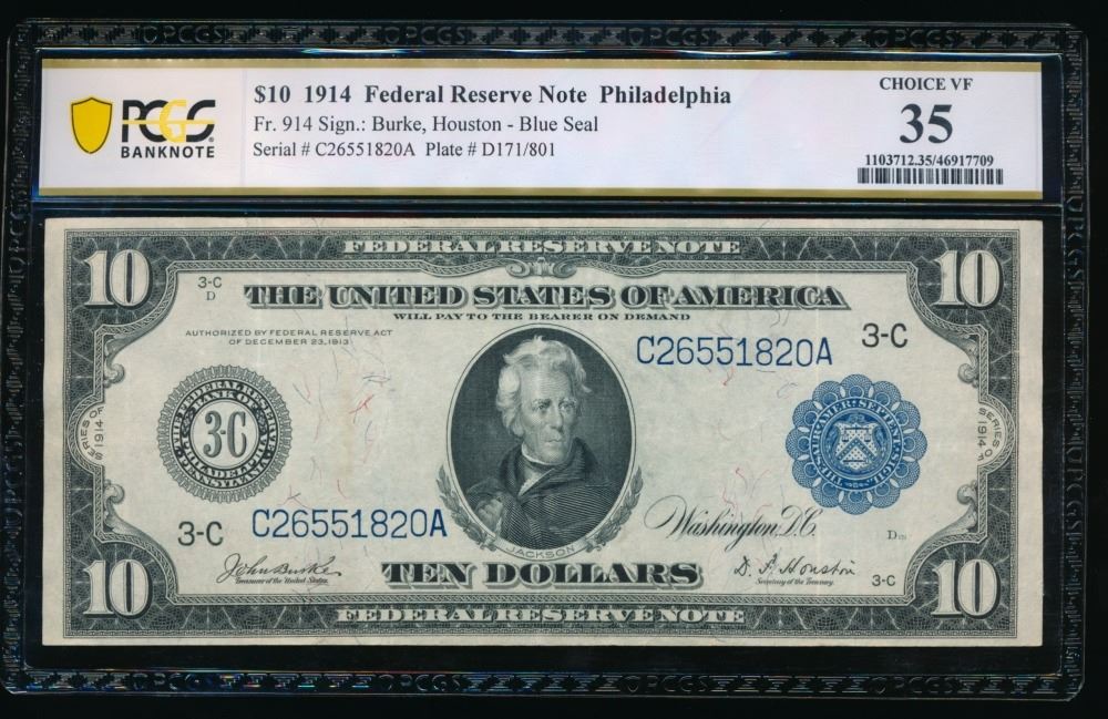 One 1914 $10 Philadelphia FRN PCGS 35.